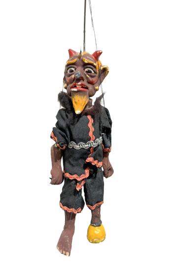 Starožitná loutka z loutkového divadla. Čertovi chyví ucho a na viditelných částech má sedřenou barvu. Nutná výměna úchytů. Má mechanické otvírání pusy. Je součástí většího celku loutkových figurek. Materiál je pravděpodobně tvrzená sádra. Loutka má na výšku 20 cm a s držákem 55 cm.