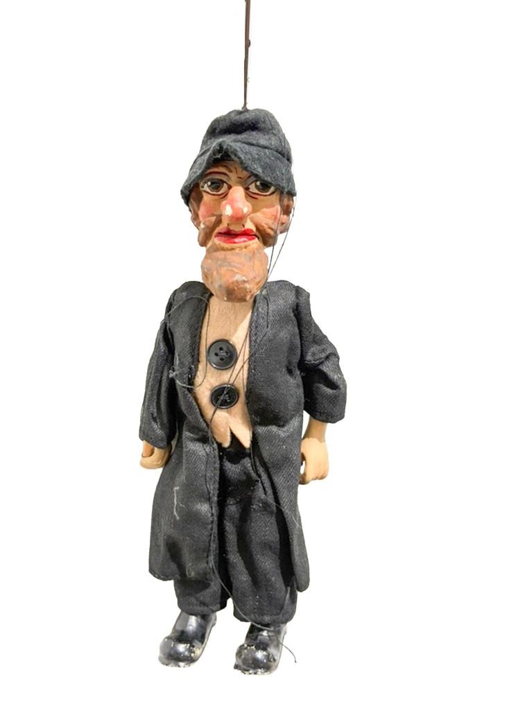 Starožitná loutka z loutkového divadla. Loutka má jen drobnou oděrku na nose. Nutná výměna úchytů. Má mechanické otvírání pusy. Je součástí většího celku loutkových figurek. Materiál je pravděpodobně tvrzená sádra. Loutka má na výšku 21 cm a s držákem 55 cm.