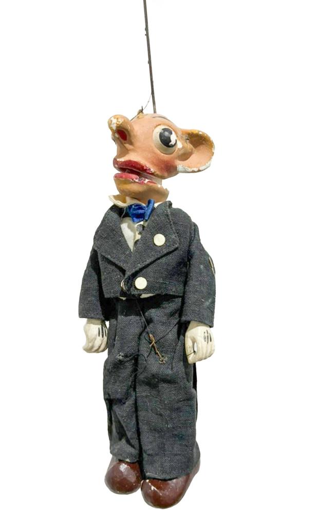 Starožitná loutka z loutkového divadla. Spejbl má na obličeji hodně oděrků, kde chybí barva. Nutná výměna úchytů. Má mechanické otvírání pusy. Je součástí většího celku loutkových figurek. Materiál je pravděpodobně tvrzená sádra. Na výšku má loutka 20 cm a s držákem 55 cm.