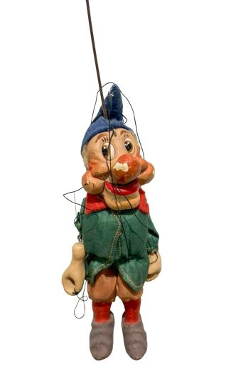 Starožitná loutka z loutkového divadla. Trpaslík má pouze lehce odřenou barvu na nose jinak je bez poškození. Nutná výměna úchytů. Má mechanické otvírání pusy. Je součástí většího celku loutkových figurek. Materiál je pravděpodobně tvrzená sádra. Na výšku má 16 cm a s držákem 55 cm.