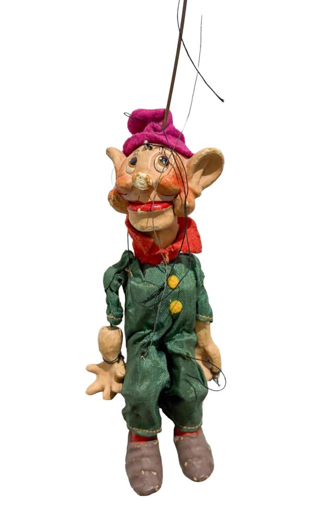 Starožitná loutka z loutkového divadla. Trpaslík má uražený kousek na nose a na pár místech odřenou barvu. Nutná výměna úchytů. Má mechanické otvírání pusy. Je součástí většího celku loutkových figurek. Materiál je pravděpodobně tvrzená sádra. Na výšku má 16 cm a s držákem 55 cm.