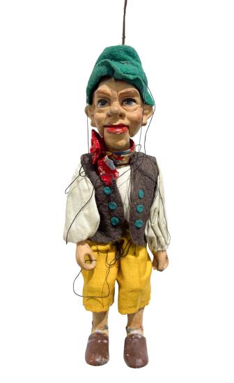 Starožitná loutka z loutkového divadla. Janek nemá žádné viditelné vady. Nutná výměna úchytů. Má mechanické otvírání pusy. Je součástí většího celku loutkových figurek. Materiál je pravděpodobně tvrzená sádra. Loutka má 22 cm a s držákem 55 cm.
