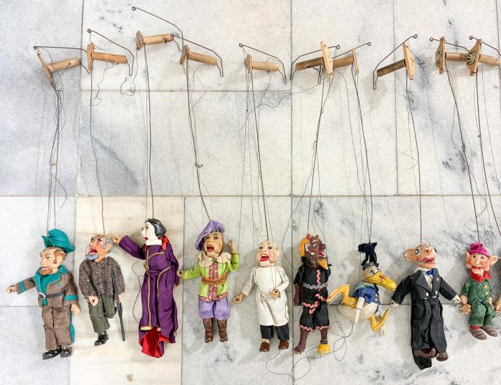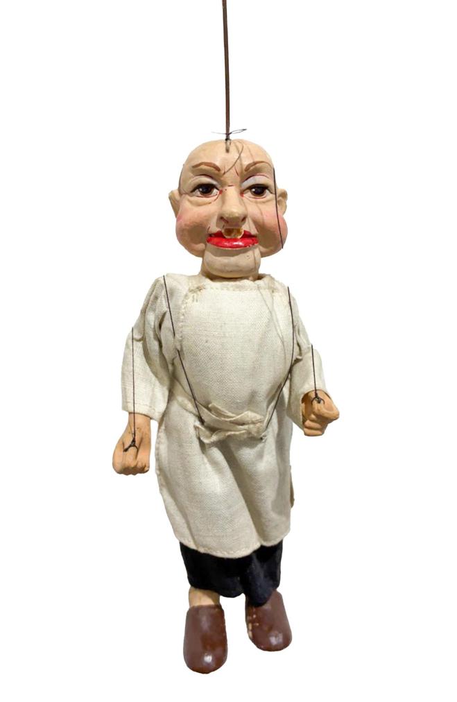 Starožitná loutka kuchaře z loutkového divadla. Kuchaři chybí vrchní ret a na hlavě má místa odřené barvy, jinak je plně funkční. Nutná oprava úchytů. Má mechanické otvírání pusy. Je součástí většího celku loutkových figurek. Materiál je pravděpodobně tvrzená sádra. Soška je vysoká 20 cm a s držákem má 55 cm.