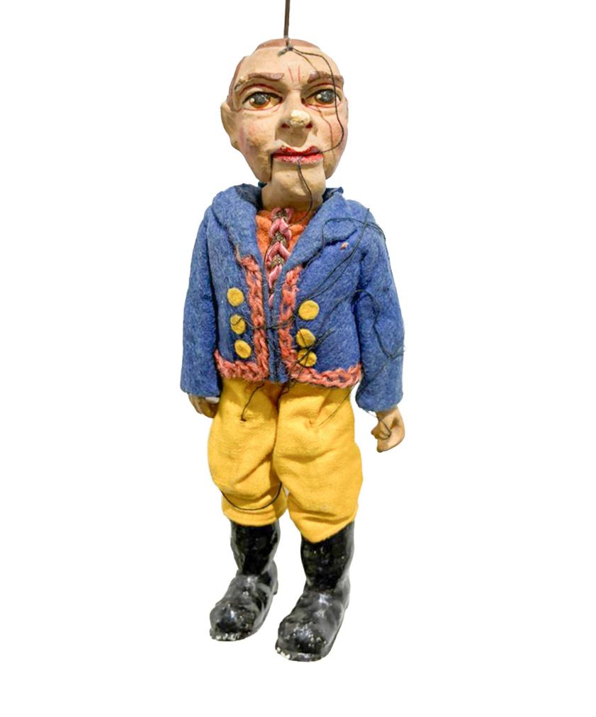 Starožitná loutka z loutkového divadla. Žandár má pouze odřený nos jinak je nenese známky poškození. Nutná oprava úchytu. Má mechanické otvírání pusy. Je součástí většího celku loutkových figurek. Materiál je pravděpodobně tvrzená sádra. Soška má 20 cm a s úchytem 55 cm.