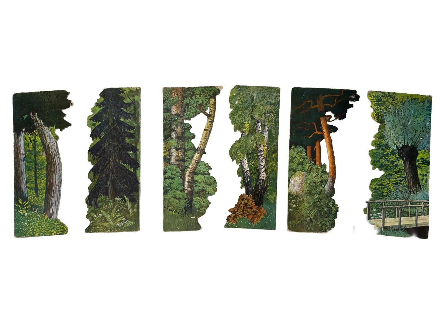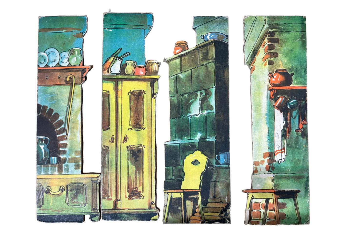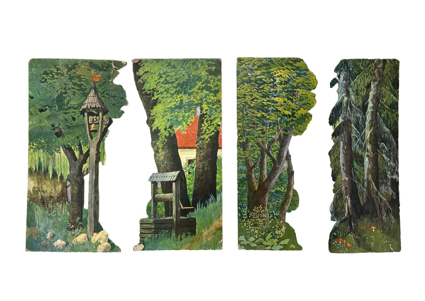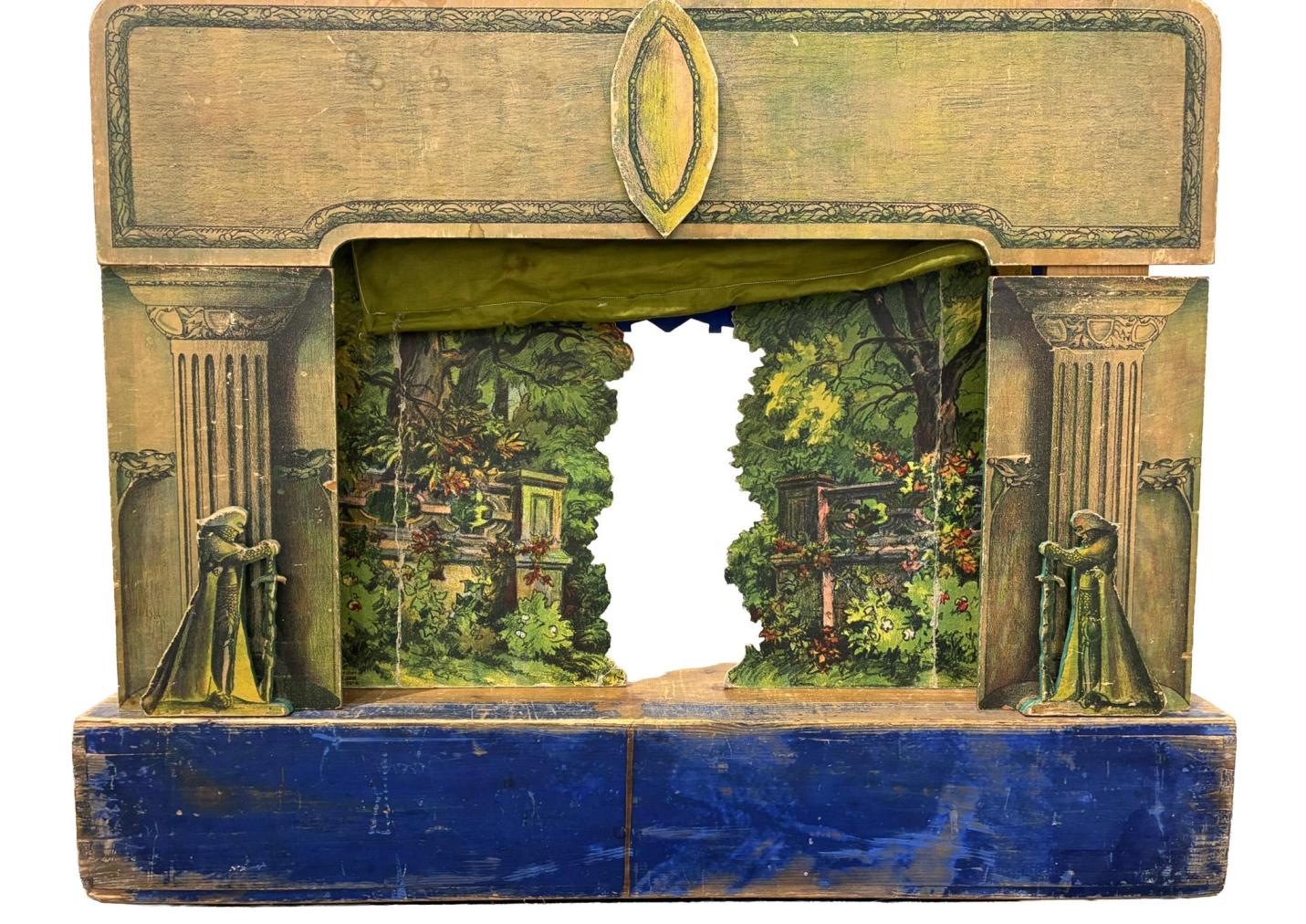 Kompletní loutkové divadlo i s různými typy kulis. Obsahuje: interiér paláce i starobylé chaloupky, prostory přírody i starého města s vysokými domy. Dále jedny kachlová kamna, stoličku, lavici, královský trůn a přírodniny jako pařez či lávku. K dispozici i dřevěné nástavce. Divadlo se dá celé složit a uschovat do kufříků.