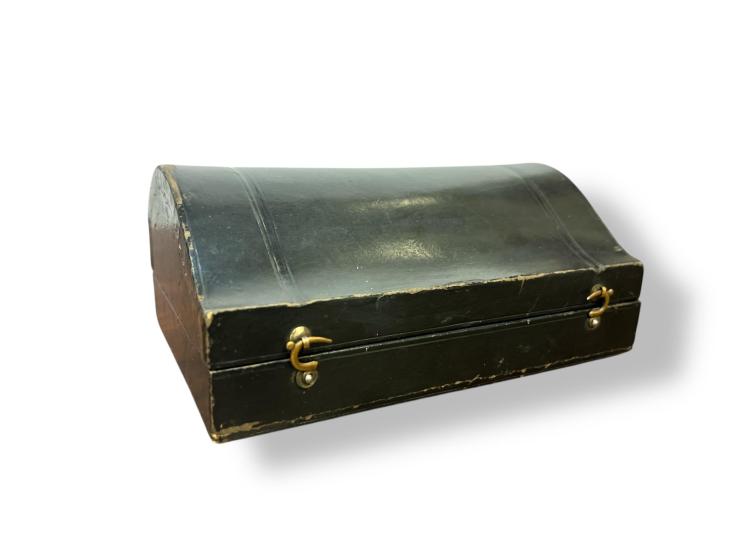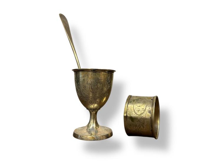 Cestovní sada na vařená vejce z alpaky v původní etui. Výška stojánku na vejce 6 cm, průměr 4 cm, délka lžičky 11,5 cm, průměr kruhové části 4 cm, šířka 2,5 cm. Rozměr etue 15,5 x 10 cm, výška 6 cm.