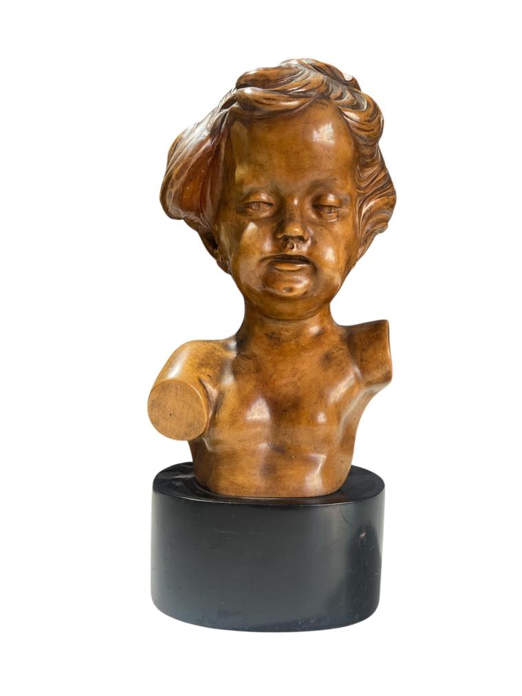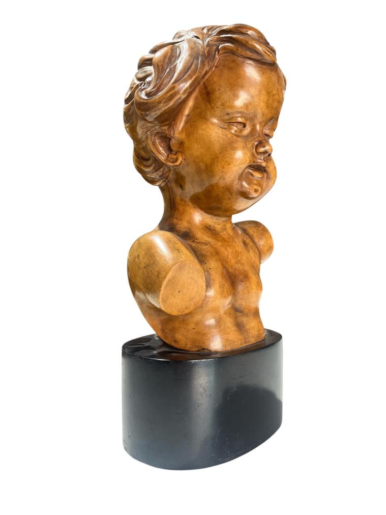 Dřevěná busta dítěte na černém podstavci. Výška - 28cm, šířka podstavce - 13cm , sokl -dřevo. Nesignováno. Profesionální řezba. Lehce patinováno. V perfektním stavu, bez poškození. Podlepeno papírem, značeno nálepkou viz foto.