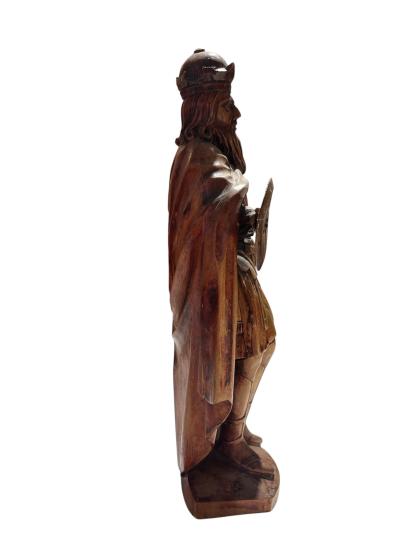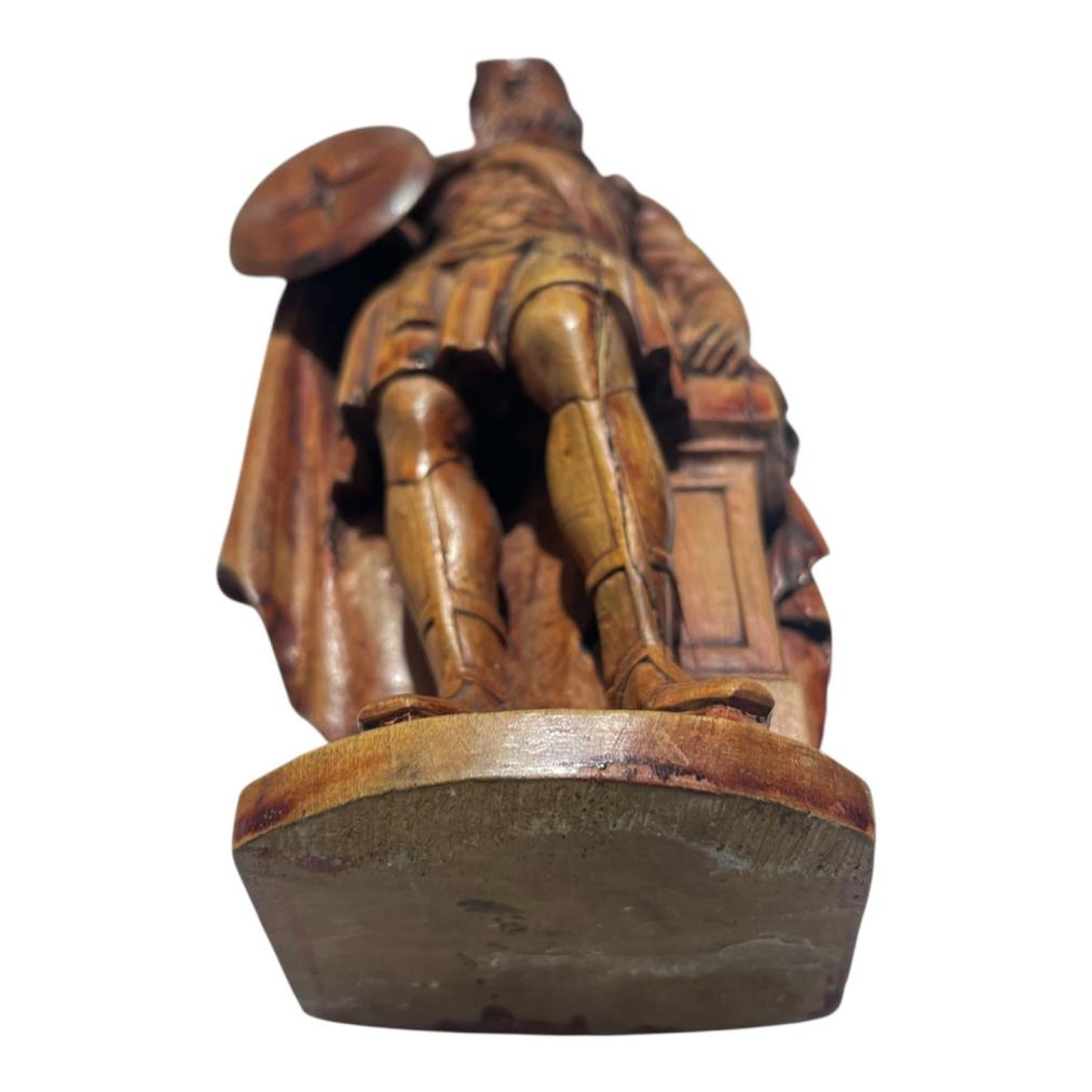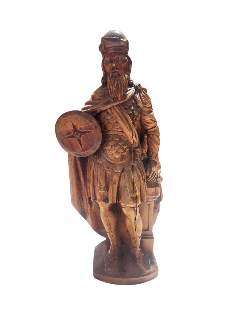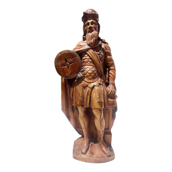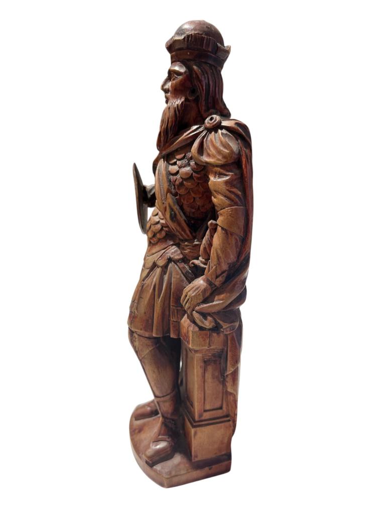Dřevěná vyřezávaná socha rytíře v šupinové zbroji a plášti. Rytíř se uvolněně opírá o sloup a k předloktí pravé ruky má připevněn štít. Na výšku měří 27 cm, v nejširším bodě měří 10 cm. Hloubka je 7 cm. Dřevem se od levého ramene táhne prasklina až ke kotníku. Štít je v polovině zlomený a je lepený. Poškození na špičce nosu. Dřevo je patinováno červenou barvou. Neznačeno.
