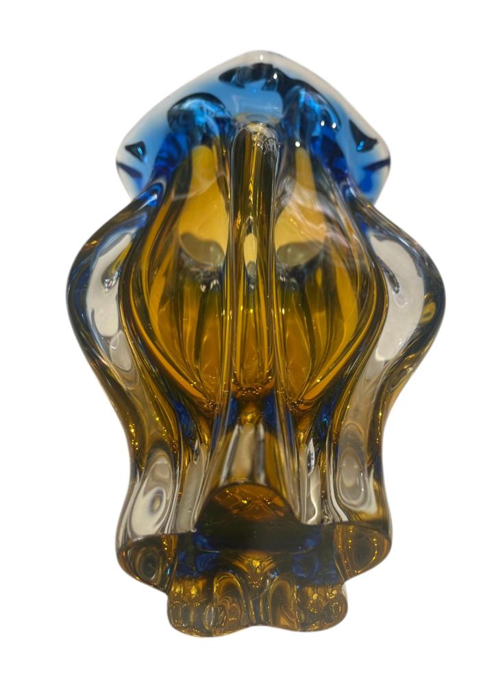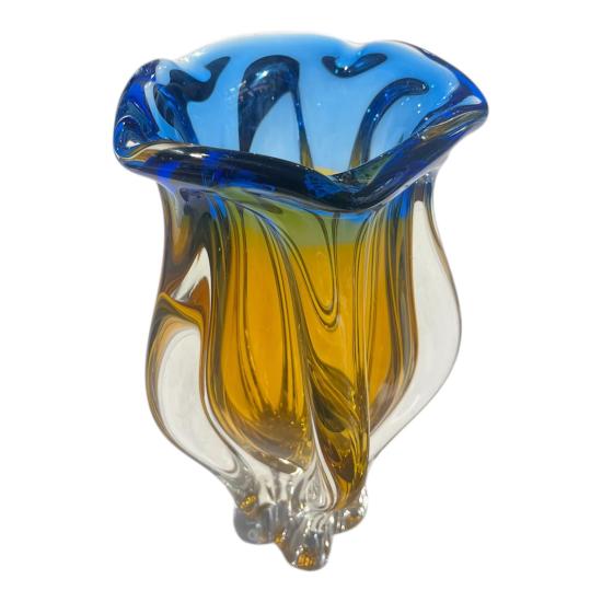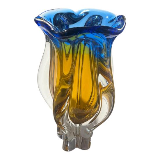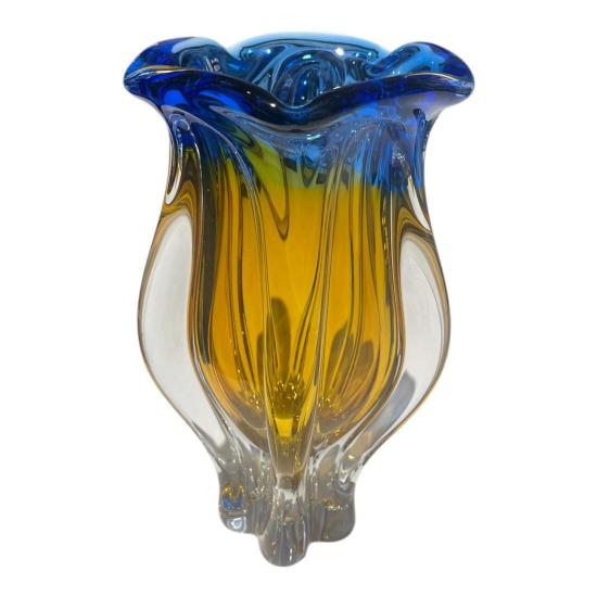 Autorská váza z hutního skla v odstínech syté modré a žluté barvy. Dle návrhu Josefa Hospodky, sklárna Chřibská. Na výšku měří 24 cm, průměr podstavy je 7 cm, v nejširším bodě měří 14 cm. Podstava je lehce ošoupaná s jedním hlubším škrábancem a jedním malým oťukem. Neznačeno.