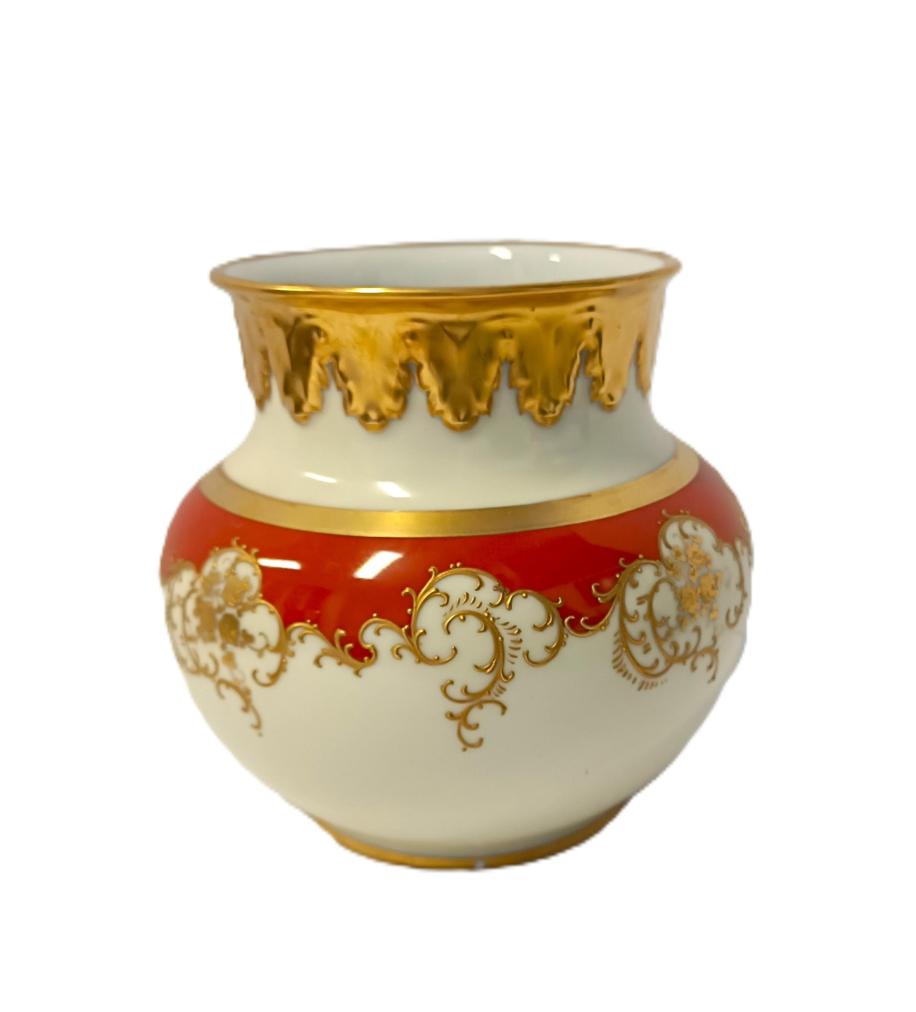 Porcelánová ručně malovaná váza zdobená zlacením. Pochází z dílny porcelánky Hutschenreuther, viz značení. Rozměry: 13,5 x 10,5 cm na podstavci o průměru 8,5cm. Váza je v krásném stavu, nepoškozena.