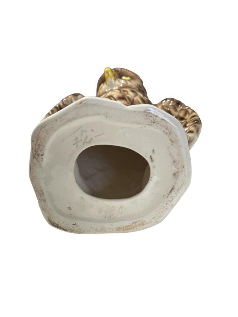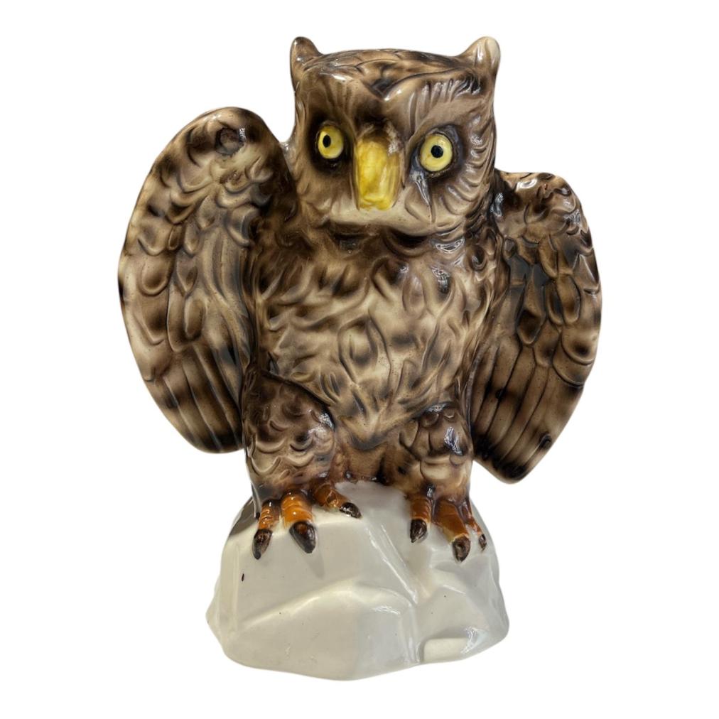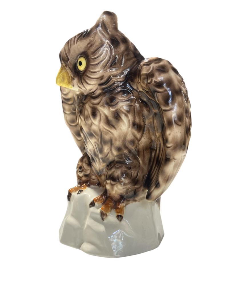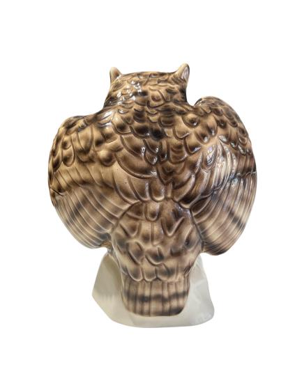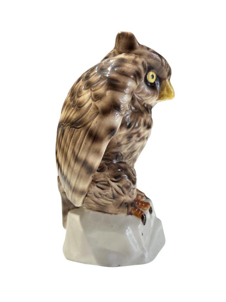 Porcelánová plastika sovy s hypnoticky výraznýma očima. Celková výška je 20 cm, v nejširší části měří 17 cm. Rozměry podstavy jsou 10,5 x 10 cm. V perfektním stavu bez poškození. Místy krakeláž glazury. Neznačeno.