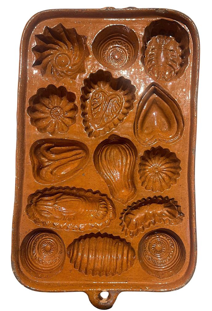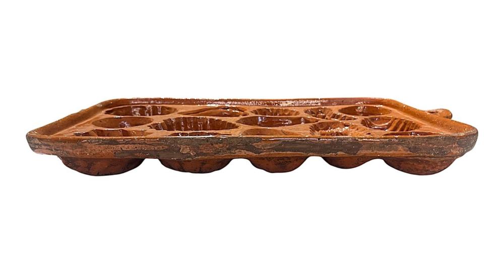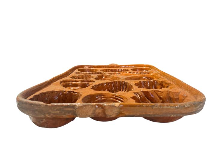 Starožitná kameninová pečící forma s různorodými vzory menších formiček, na tradiční kynuté pečivo zvané beleše/beneše. Rozměry obdelníkového rámu jsou 46 x 29 cm. Hloubka je 5 cm. Na vnejších okrajích může být oprýskaná glazura, nebo oťuky.