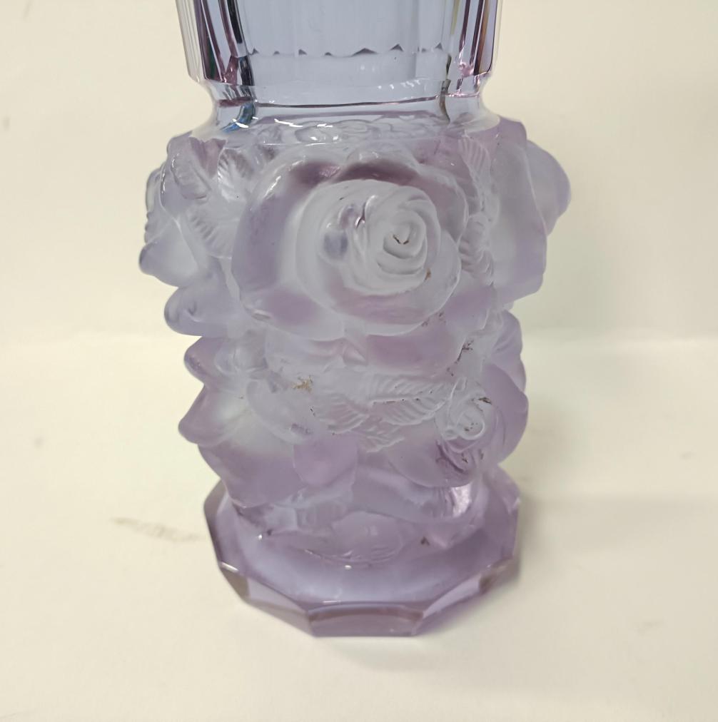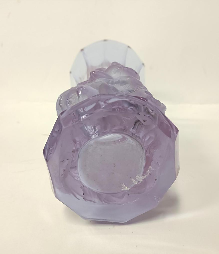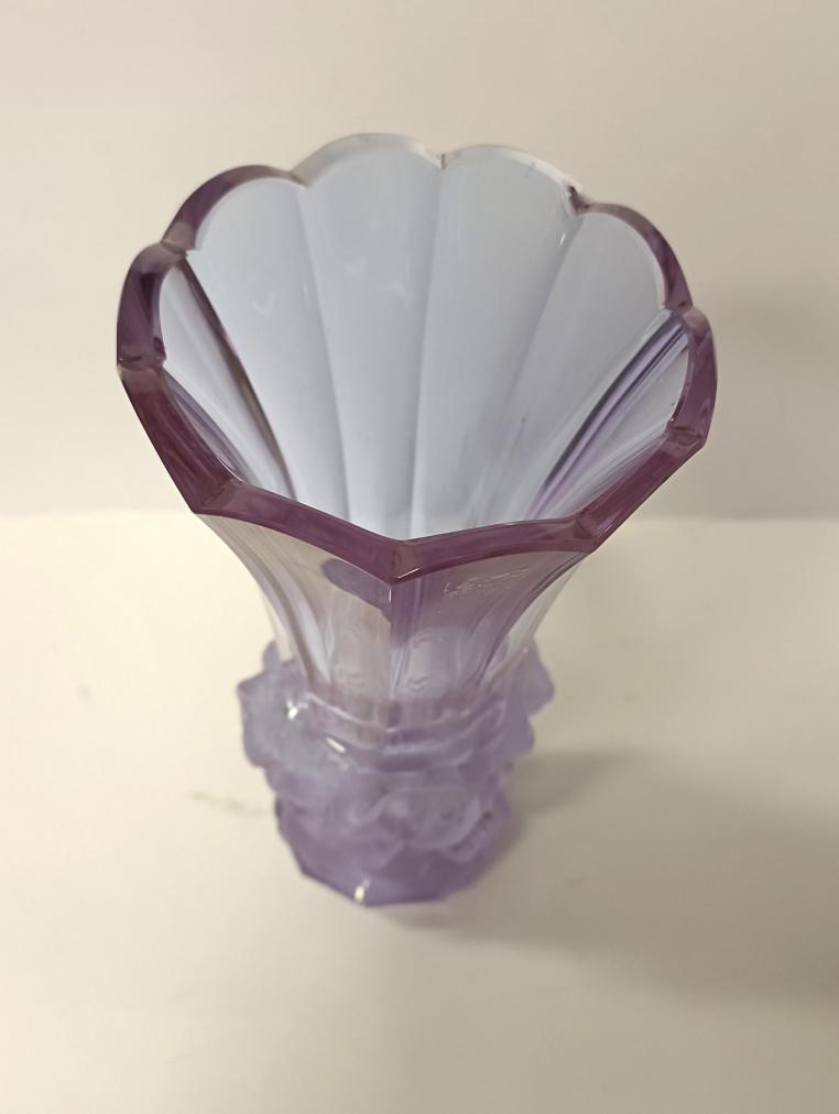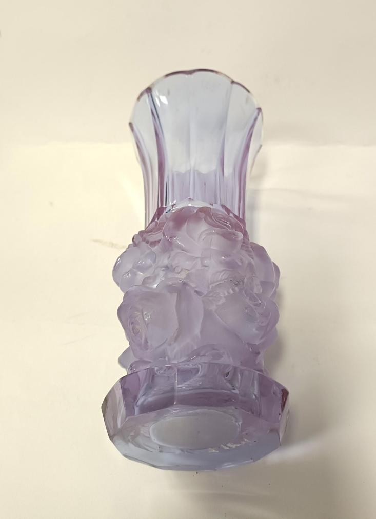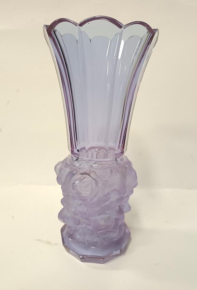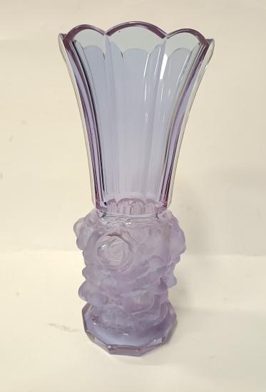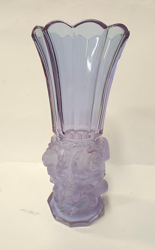 Krásná starožitná váza z alexandritového leštěného a matovaného skla z kolekce Ingrid od firmy Curt Schlevogt. Váza je zdobená reliéfním motivem růží. Rozměry 24,5 x 11 cm. Krásný stav, nepoškozena.