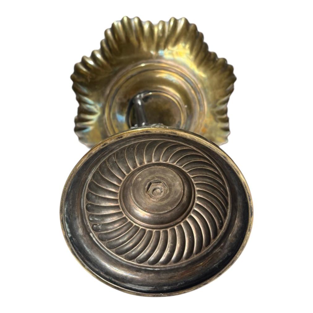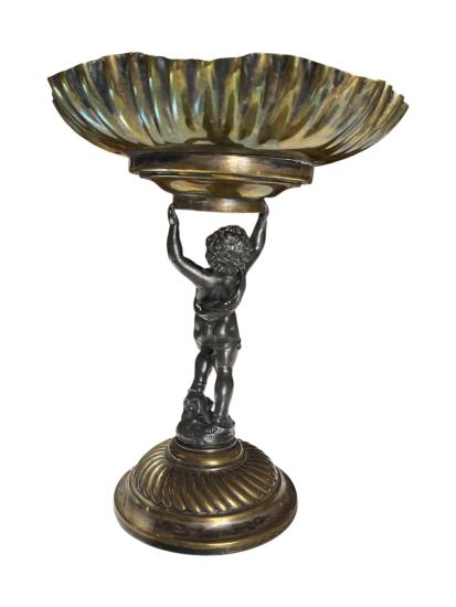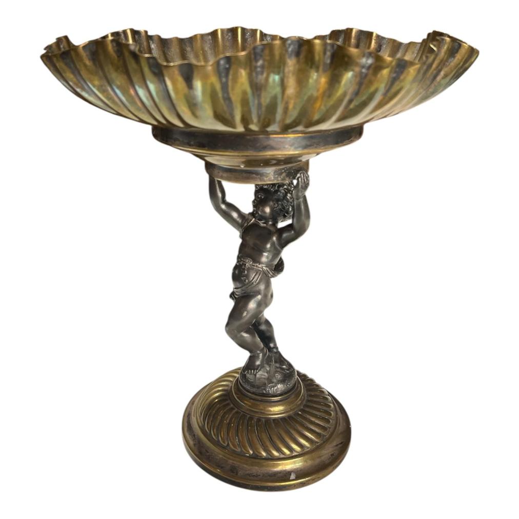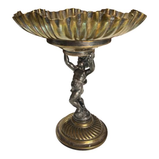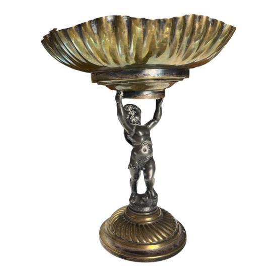 Starožitný kovový nástolec s figurální montáží- Putti na podstavci, držící vrchní díl. Na výšku celkově měří 26,5 cm. Průměr mísy je 22 cm. průměr podstavy je 11,5 cm. Putti měří na výšku celkově 15,5 cm. V dobrém stavu bez poškození, jen levá noha Puttiho má lehkou oděrku. Neznačeno.