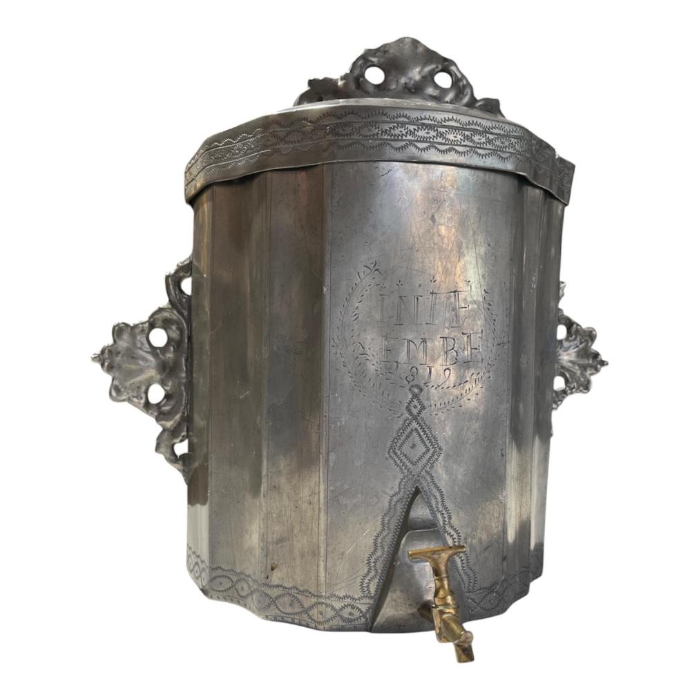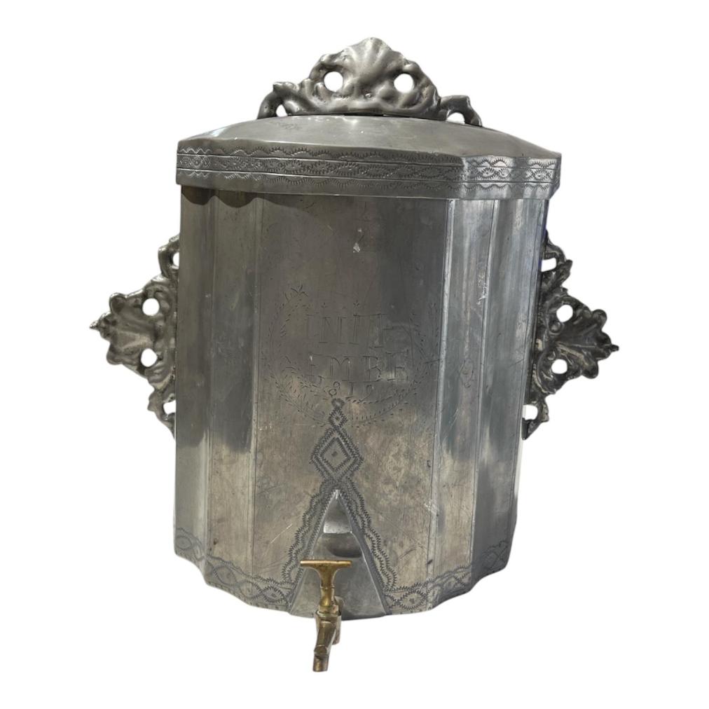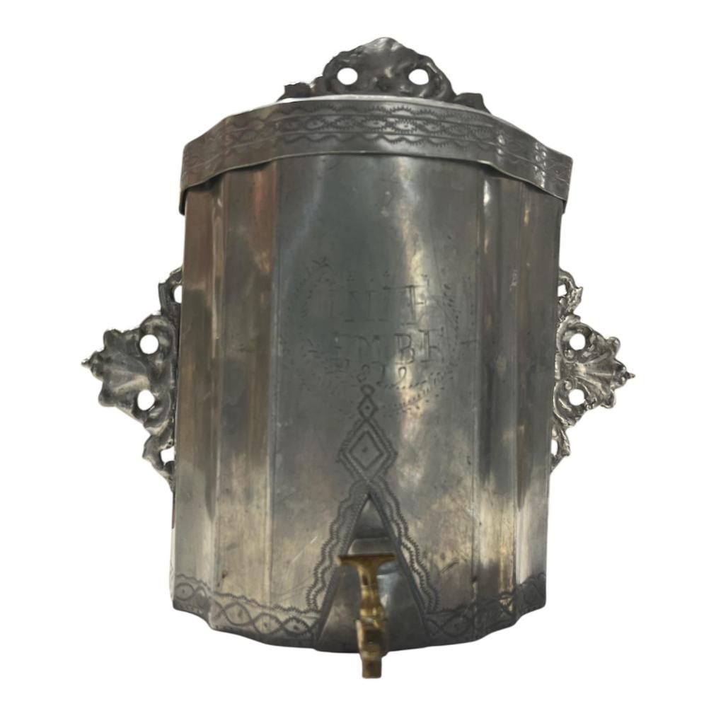 Starožitná cínová nádrž na vodu s mosazným kohoutkem. Zdobená rytinou a nápisem v přední části. Nádrž je opatřena víkem a ozdobnými úchyty k připevnění. Celková výška i s víkem je 31 cm. V nejširším bodě měří 33,5 cm. Hloubka je i s kohoutkem 19 cm. Stav odpovídá stáří. Neznačeno.