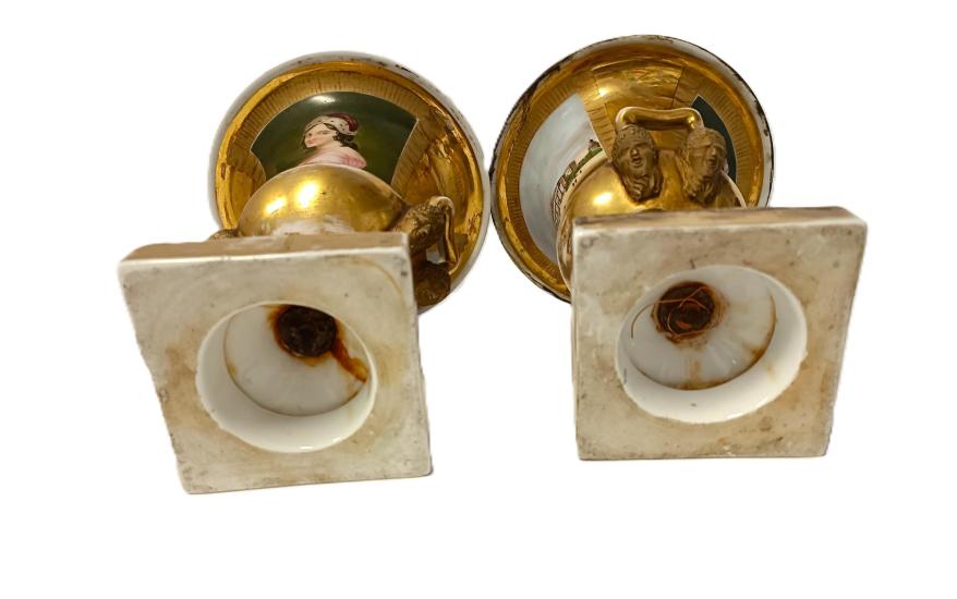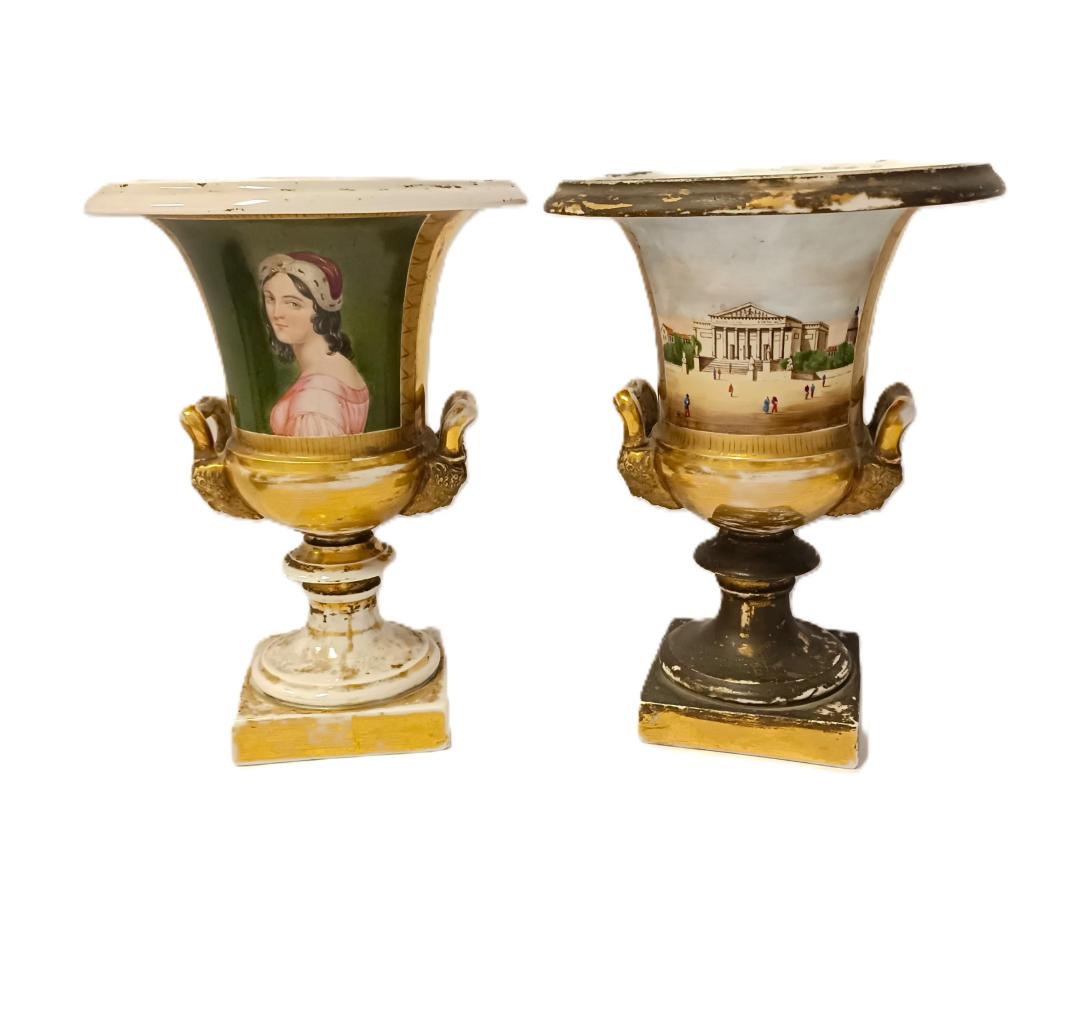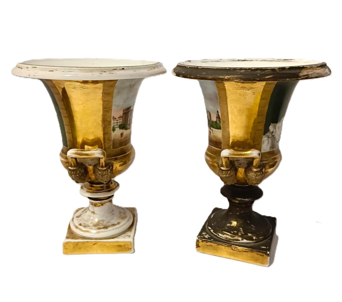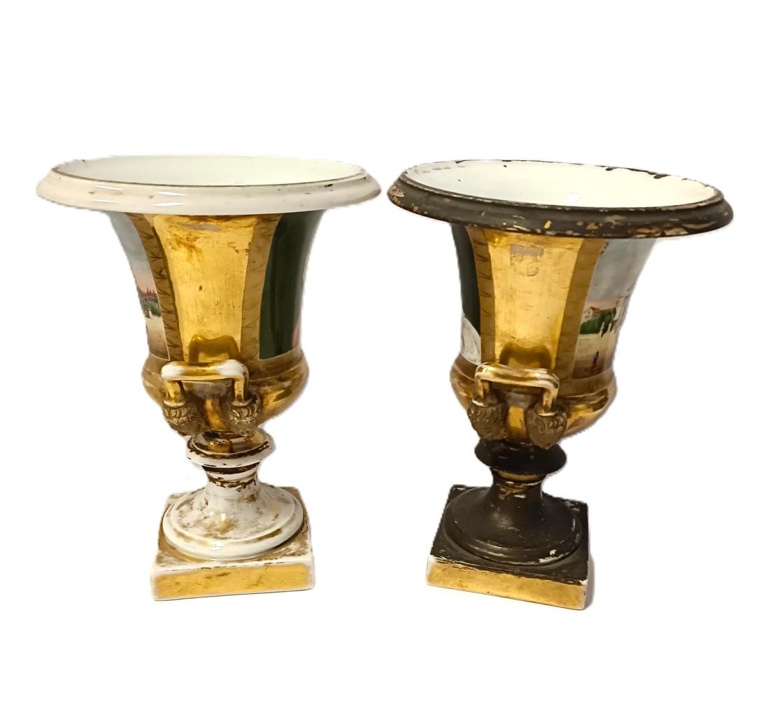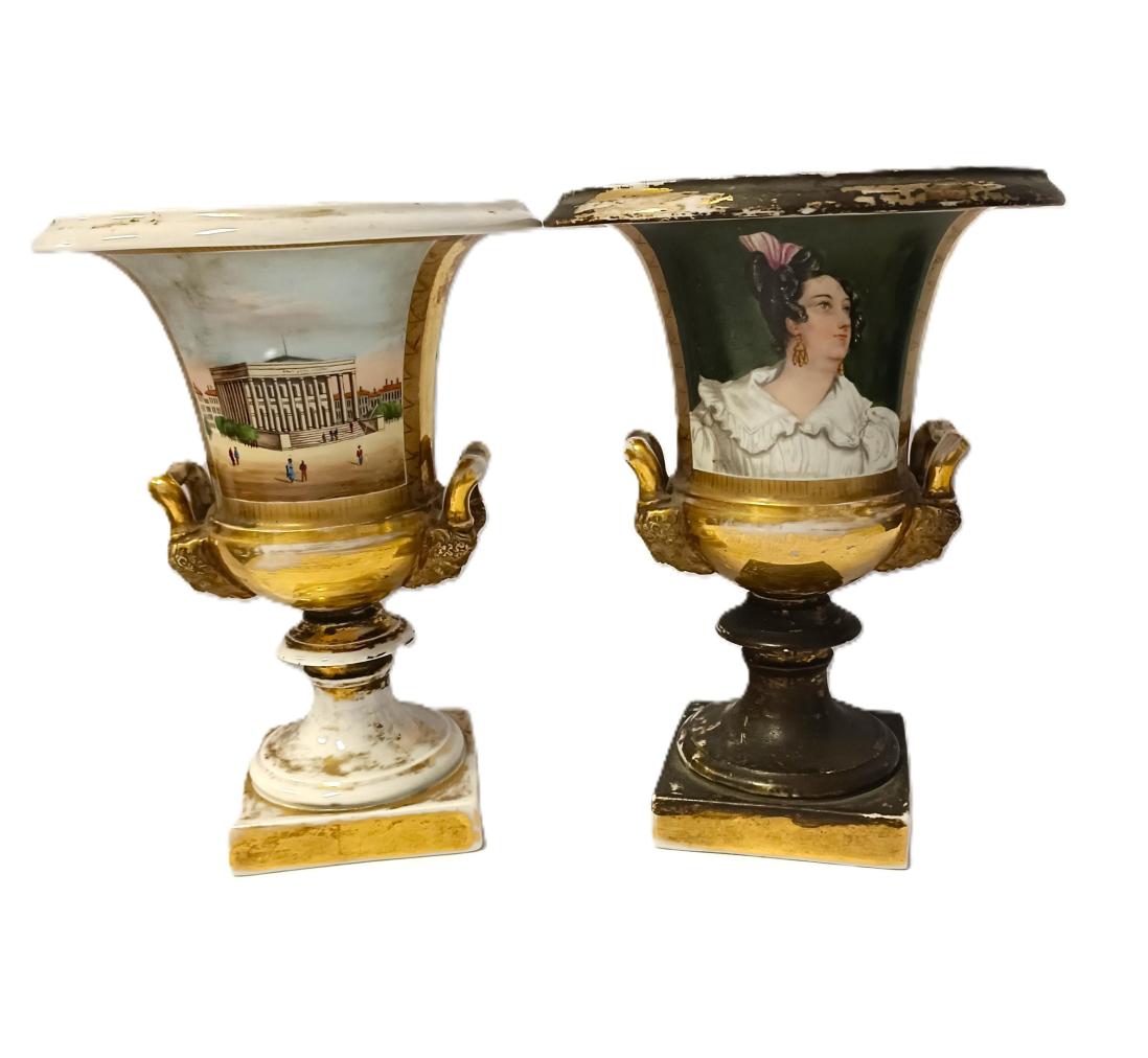 Vázy z pozlaceného porcelánu ve tvaru ,,Medicejské vázy" s bočními uchy ve tvaru maskaronu. Na každé váze je portrét a budova s prostranstvím. Zlacení se místy setřené. Rozměry: 22 x 15,5 cm na podstavci o průměru 8,5cm.