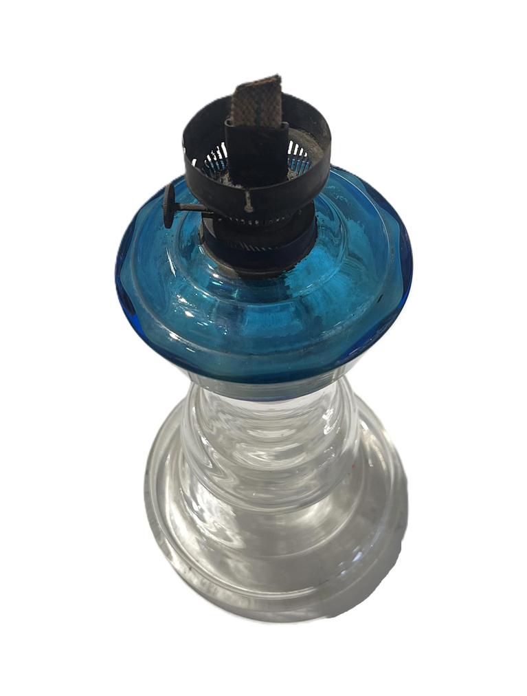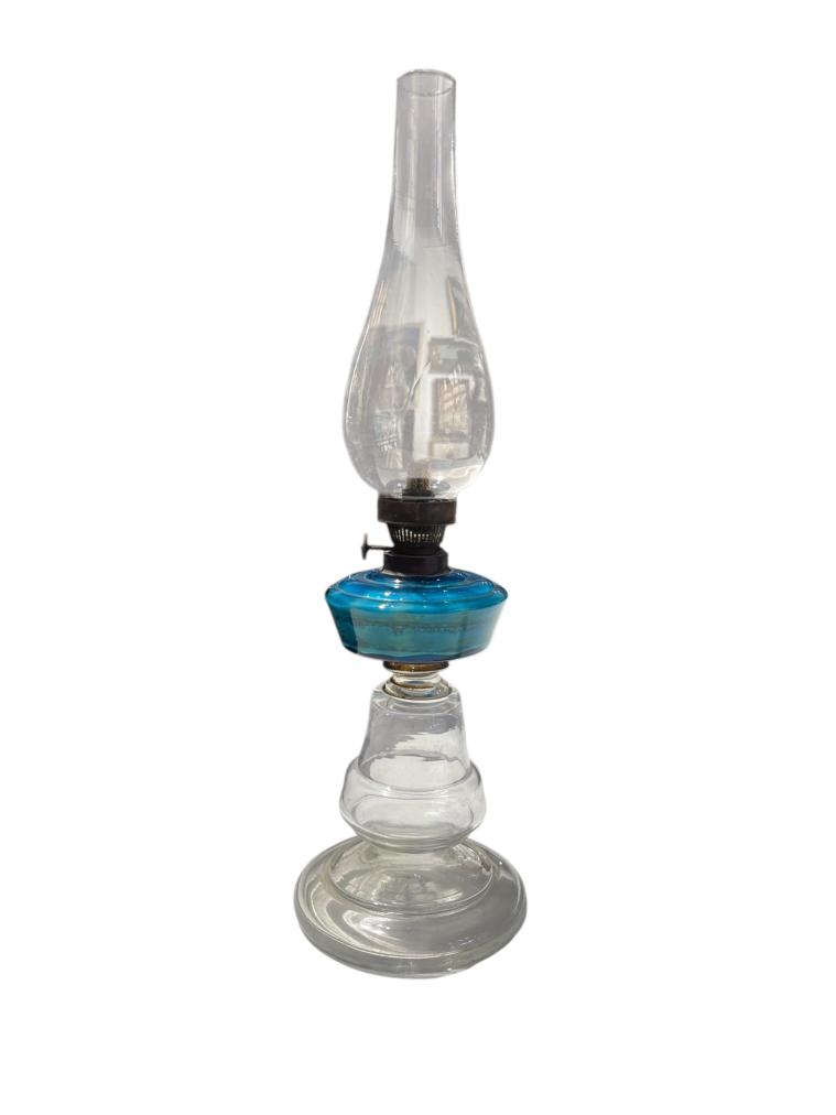 Petrolejová lampa s tyrkysově modrou nádobkou na petrolej. Celková výška je 45 cm. Průměr podstavy je 14 cm. Nádržka na petrolej má průměr 11 cm. Perfektní stav bez poškození, pouze usazeniny a oxidace kovu. Neznačeno.