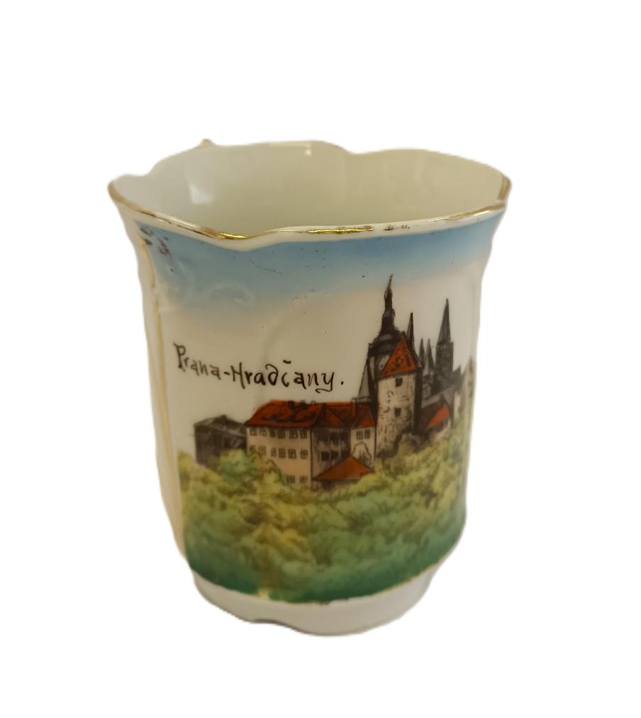 Krásný malovaný porcelánový hrneček s motivem Prahy Hradčany. Rozměry: 9 x 8 cm. Hrneček je bez poškození.