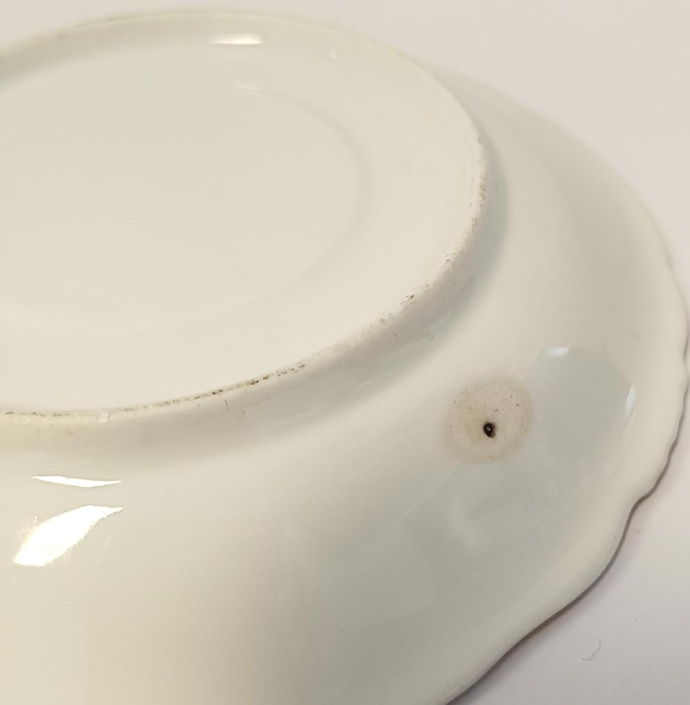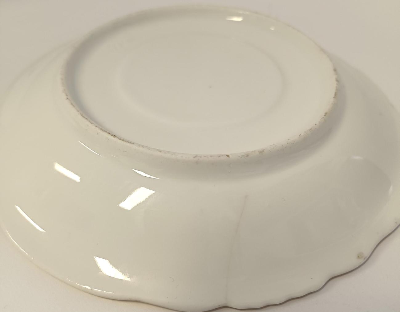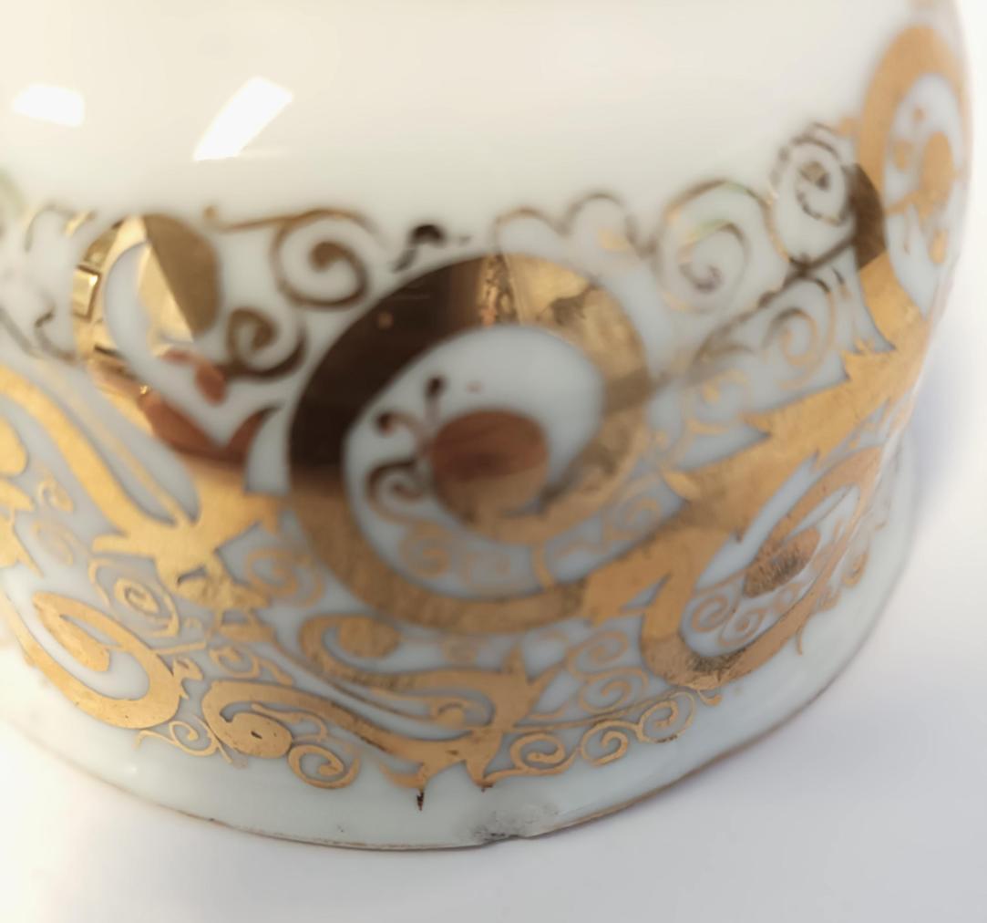Porcelánový šálek s podšálkem se zlatými ornamenty. Rozměry: Šálek: 6 x 9,5cm, podšálek: 2,5 x 15,5 cm. Šálek i podšálek mají místy ošoupané zlacení a mírné oťuky viz foto.
