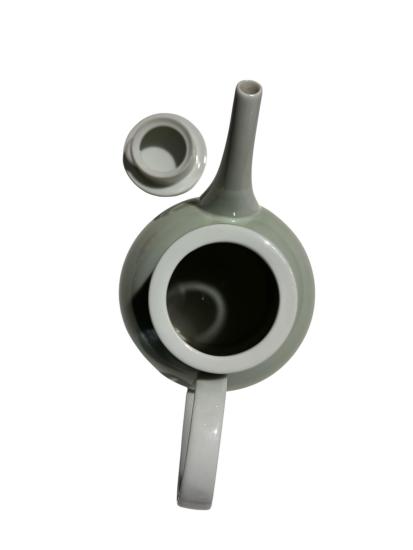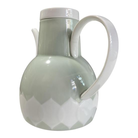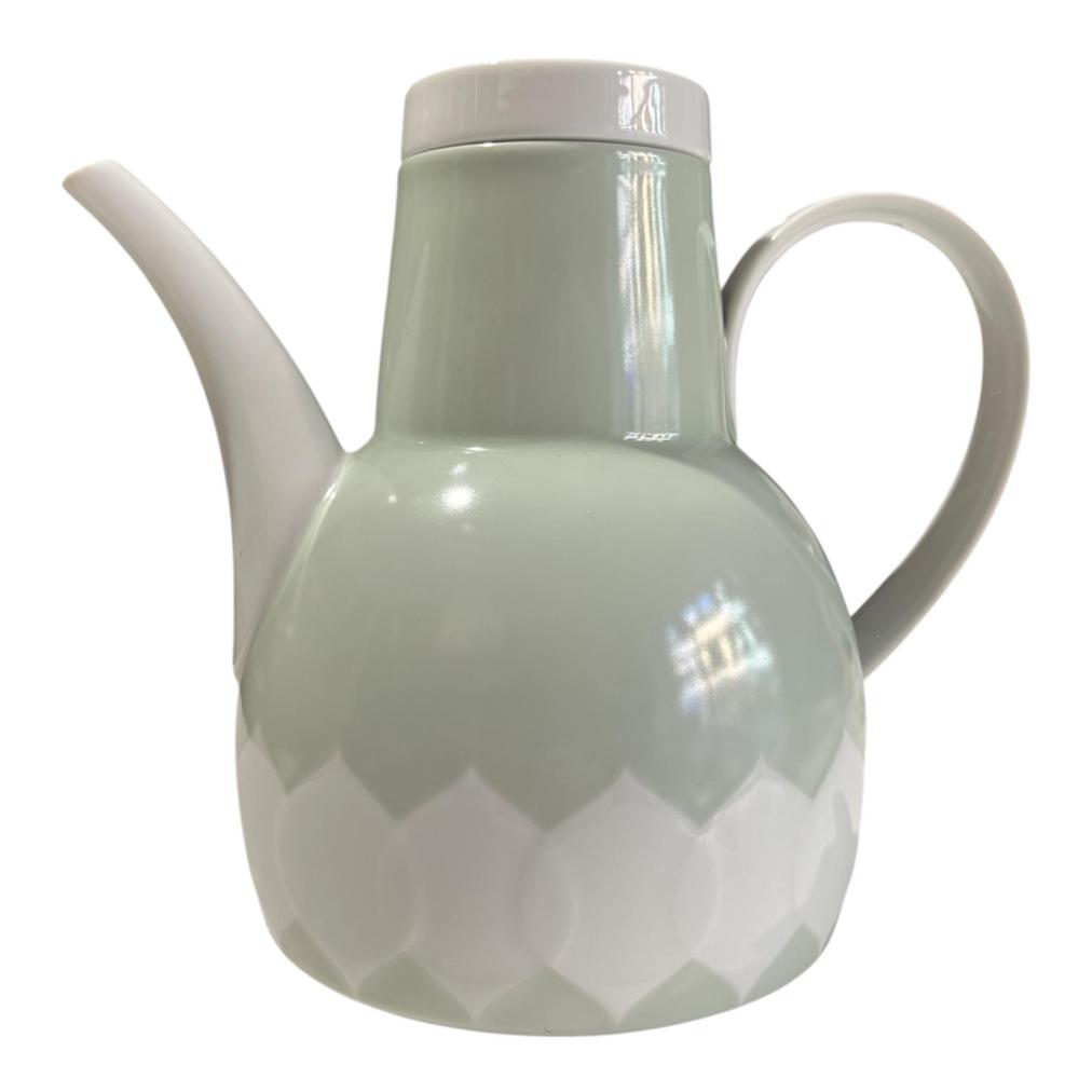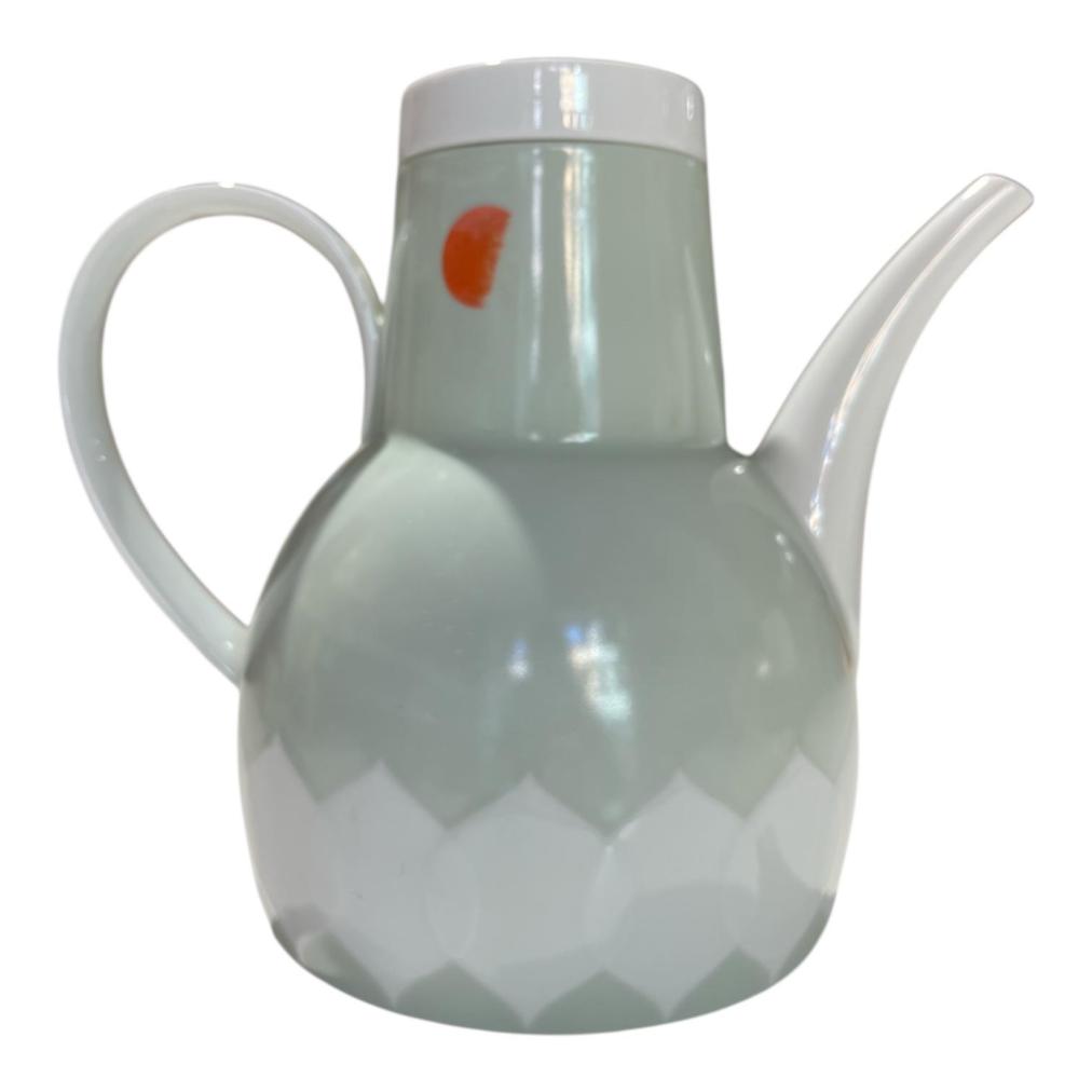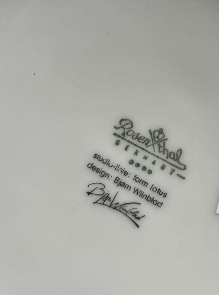 Porcelánová konvice označena razítkem 'Rosenthal studioline, má dodatek s podpisem: 'Björn Wiinblad. Výška konvice je 18 cm, celková šířka je 21 cm, průměr podstavy je 10 cm. Bez poškození, pouze prasklina ve vrchní části ucha. Značeno- Rosenthal.