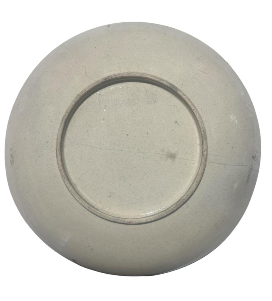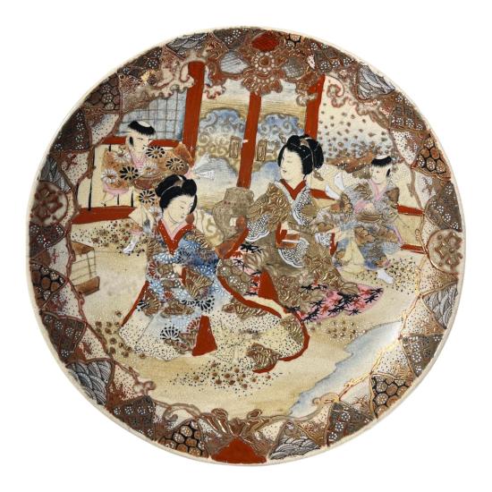 Velký keramický talíř s orientální tematikou vyobrazující ženy s dětmi, trávící čas v zahradě. Talíř se vyznačuje bohatými detaily a zdobným lemováním. Smalt, glazura a zlacení, ručně dekorováno. Průměr talíře je 31 cm. Průměr podstavy je 16 cm. Na talíři se nachází cca 21 cm dlouhá puklina a místy je ošoupaná barva a zlacení. Značeno drobnou, špatně čitelnou, vtlačenou značkou ze spodní strany. Na výšku měří 5 cm.