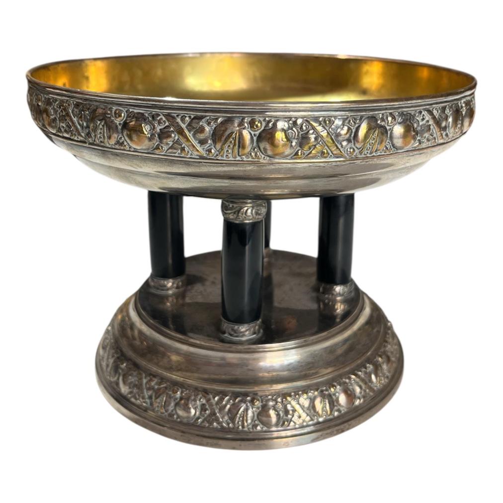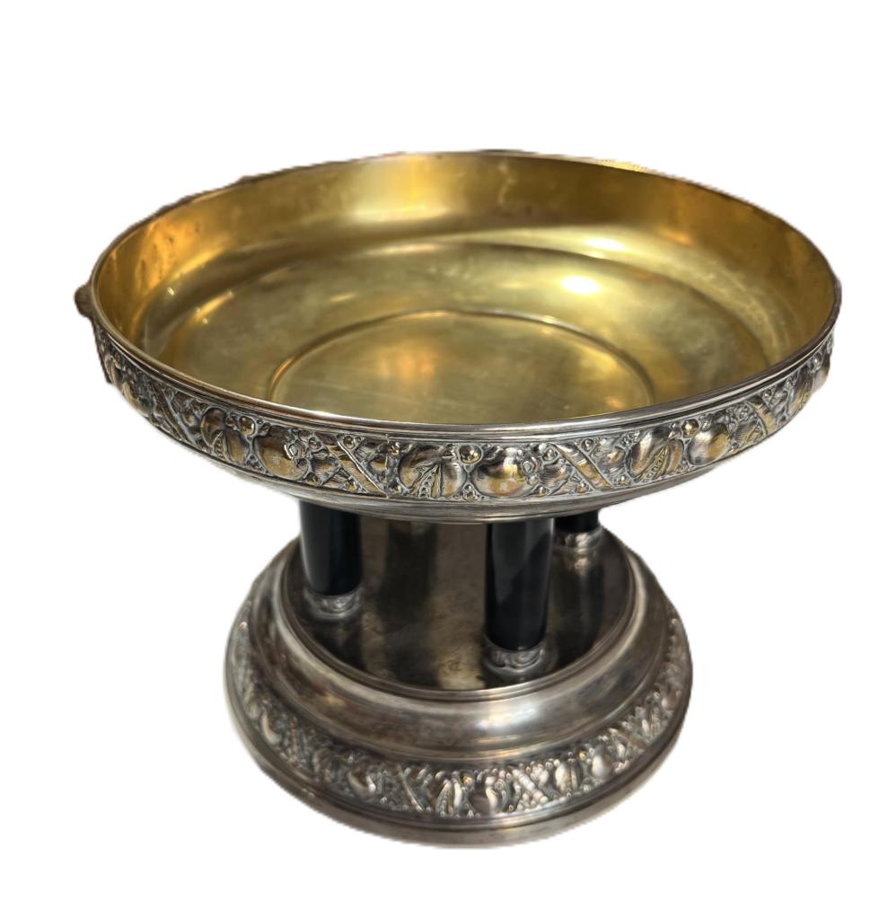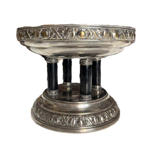 Tento kovový secesní nástolec se čtyřmi antickými sloupy černé barvy, měří celkově na výšku 15 cm. Průměr mísy je 20,5 cm, průměr podstavce je 16,5 cm. Okraje zdobí reliéfní lemování se vzorem ovoce a květů. Kromě oxidace ve stříbrné barvě je nepoškozen a ve skvělém stavu. Značeno ze spodní strany podstavy viz foto. Sklo chybí.