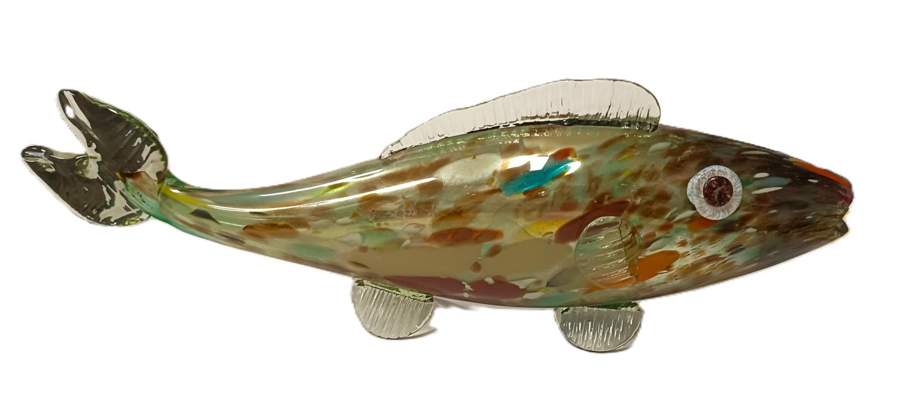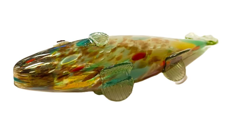 Skleněná plastika barevná ryba. Rozměry: 33 x 4 cm. Ryba má poškozenou pusu, viz foto