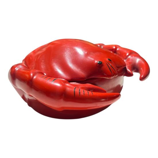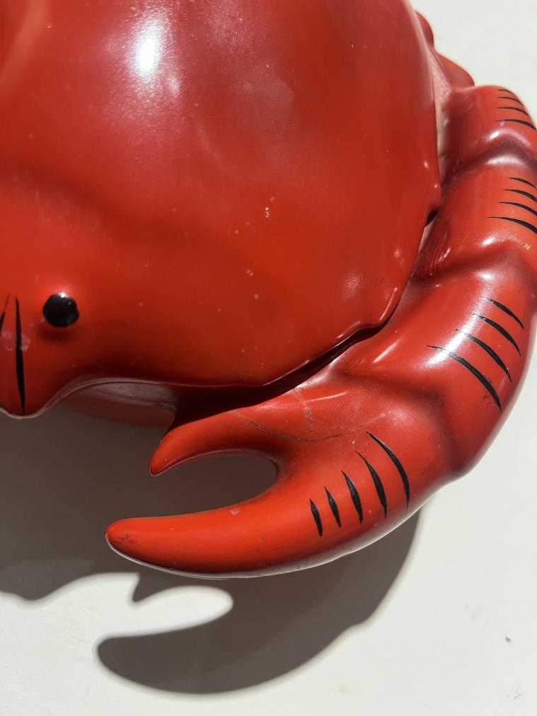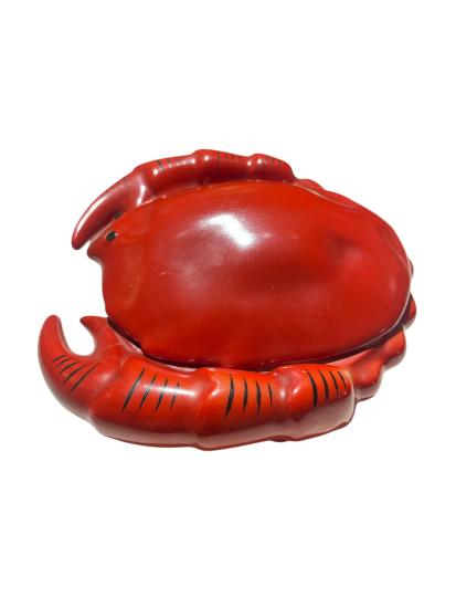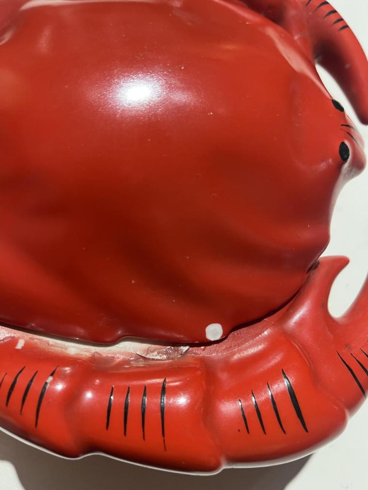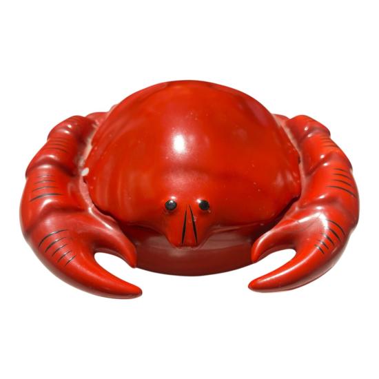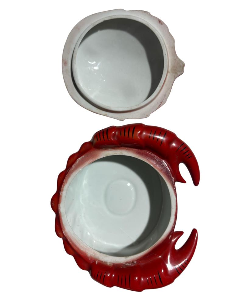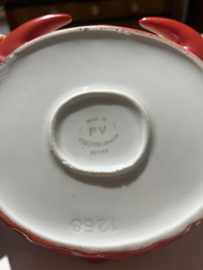 Unikátní porcelánová dóza ve tvaru kraba, značky PV Czechoslovakia, vyorbena v porcelánce ve Staré roli. Starožitná dóza je ručně malovaná v sytém červeném dekoru s černými detaily. Na výšku měří 8 cm, v nejširším bodě má 20 cm. Délka/hloubka je 19 cm. Průměr otvoru je 12,5 cm. Dóza má na levé straně drobný oťuk a prasklinu na víku, prasklina se nachází také na pravém klepetu, viz foto. Značeno ze spodní strany dole značkou PV Czechoslovakia.