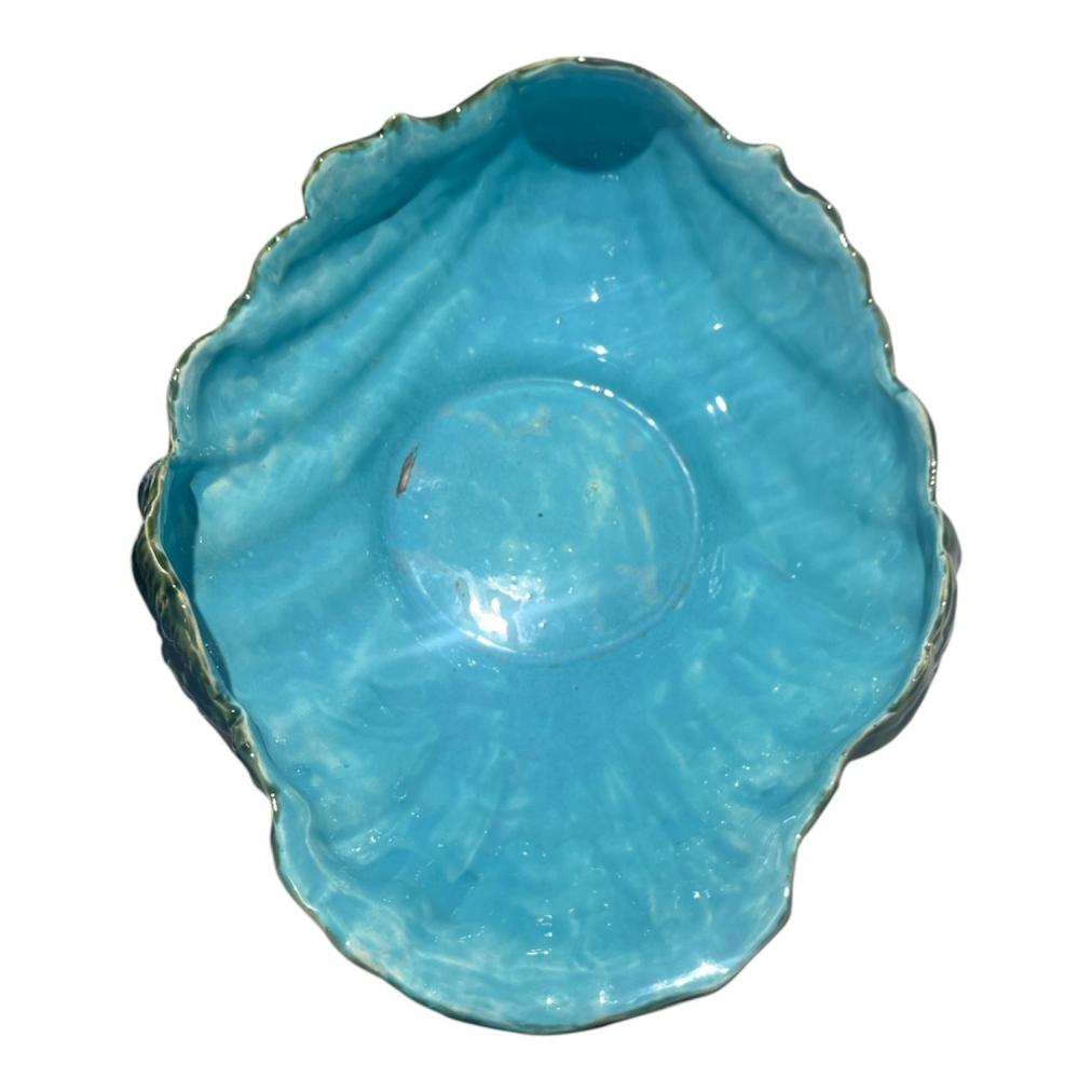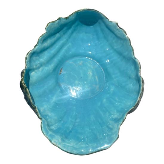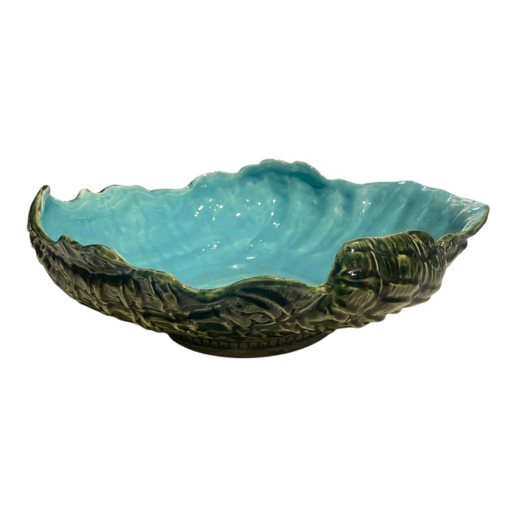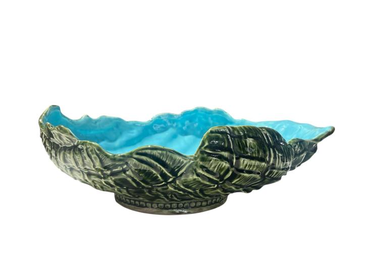 Velká keramická mísa, která svým tvarem, reliéfem a barevností připomíná list. Interiér je dekorován bledě modrou glazurou. Na výšku měří 14 cm, délka 48 cm, šířka 39 cm. Průměr podstavy je 29 cm. Na hraně podstavy se nachází oťuk viz foto, a uvnitř mísy jeden větří defekt v podobě vypadené barvy a pár menších. Glazura má místy vlasové trhlinky. Neznačeno.