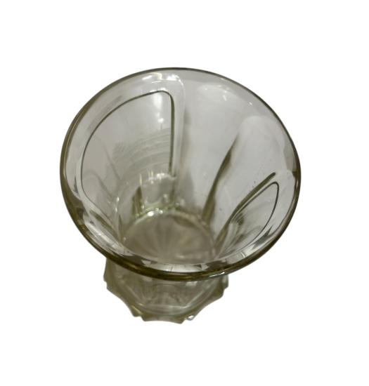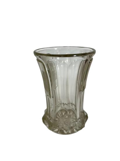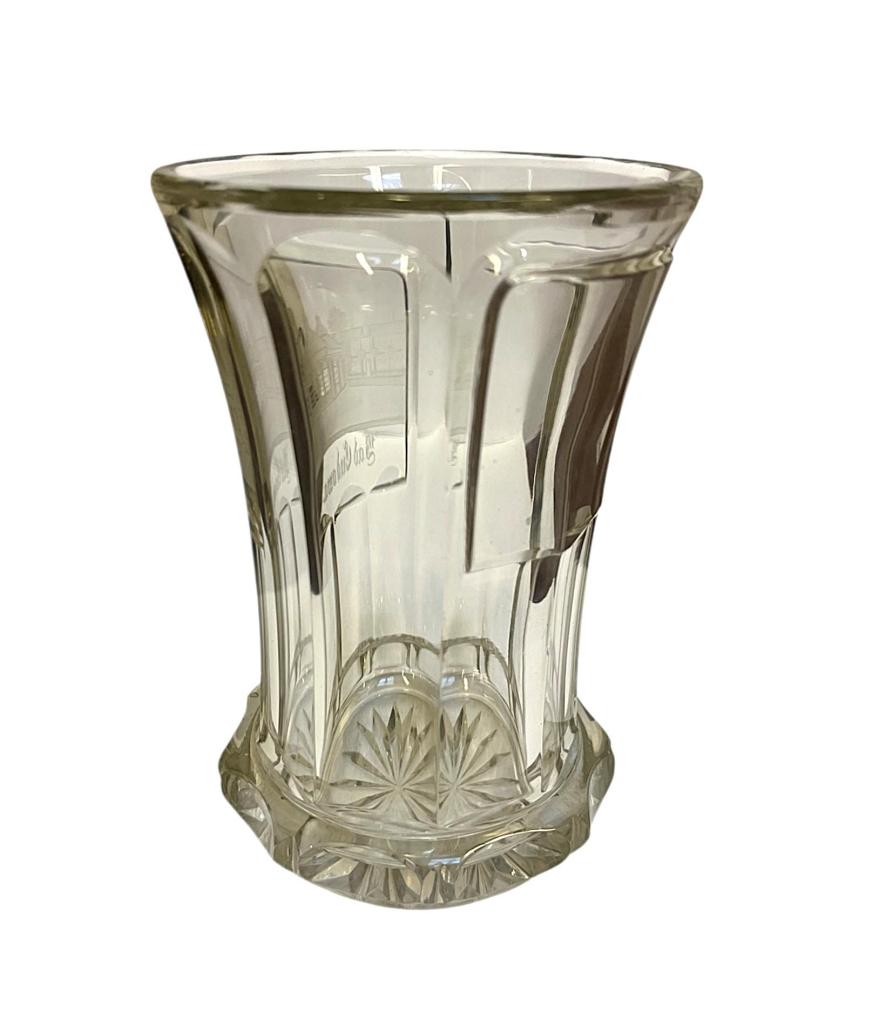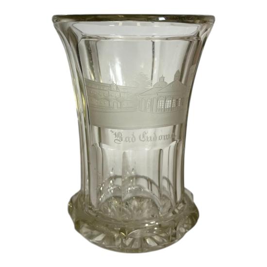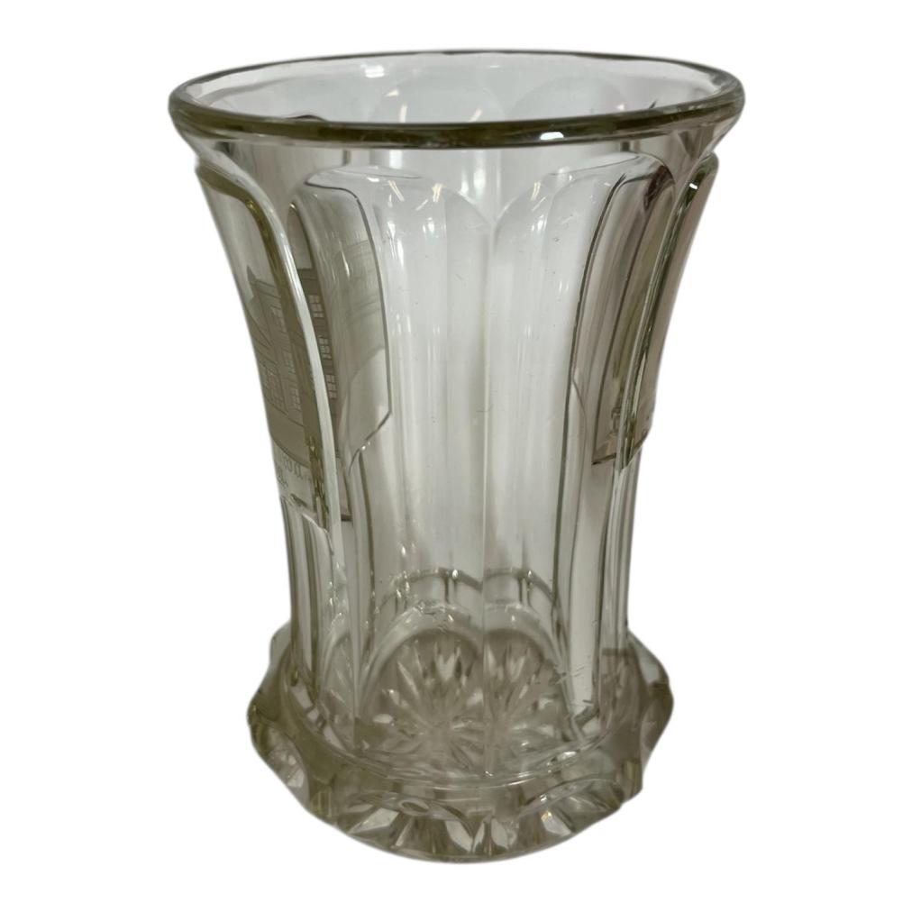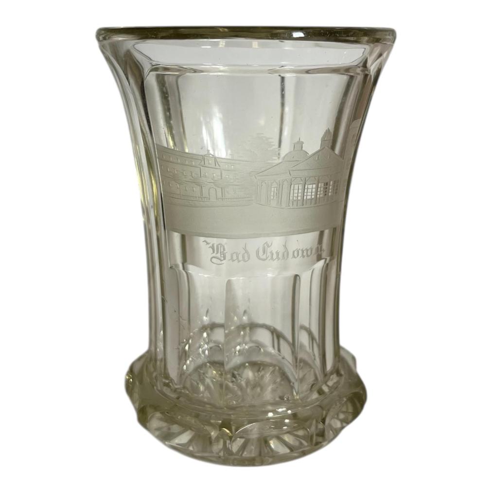 Krásný starožitný lázeňský pohárek s leptanou plochou s motivem lázeňského komplexu. Výška 12,5 cm, průměr hrdla 9 cm, podstava 6,5 cm. Podstava je ošoupaná a s několika mělkými škrábanci.