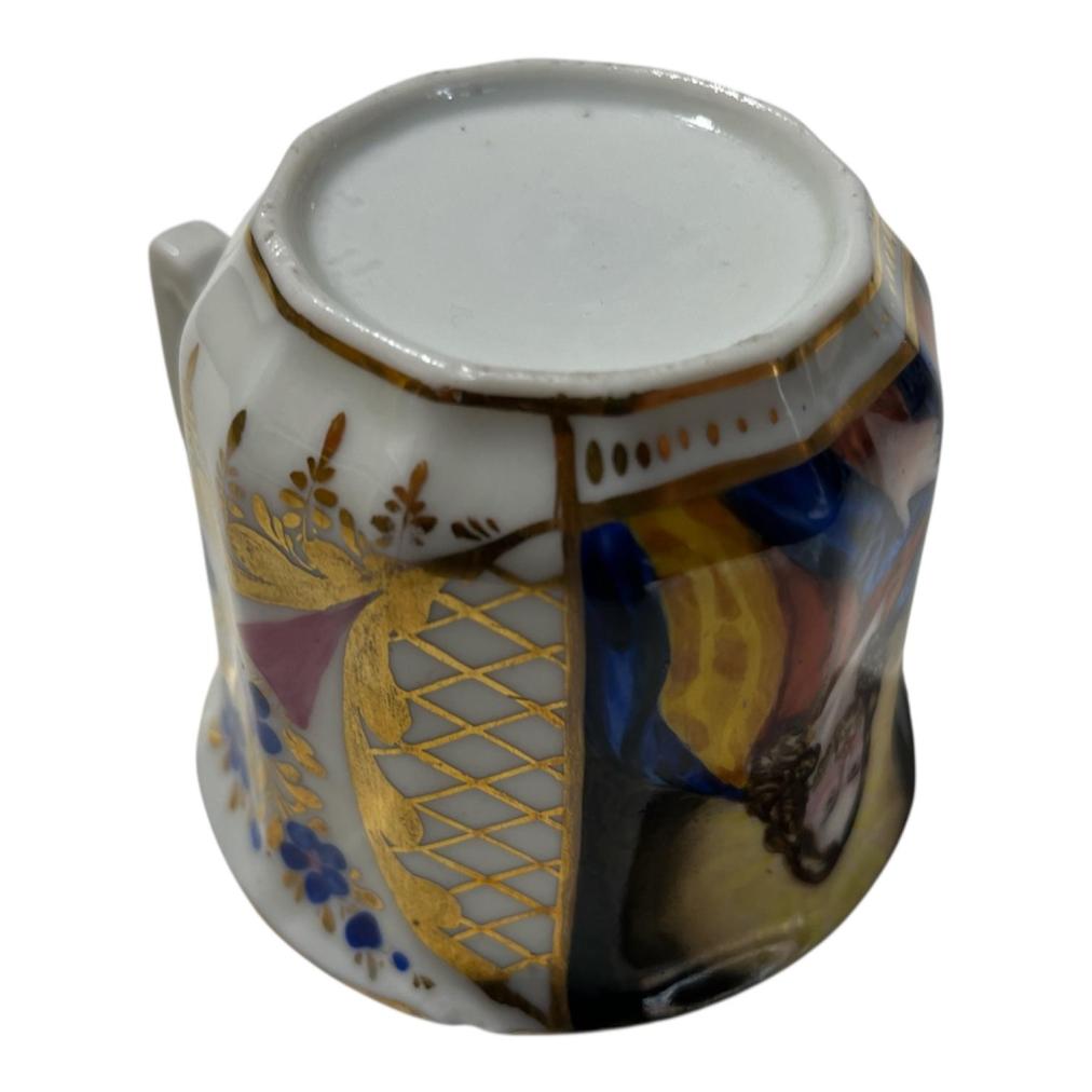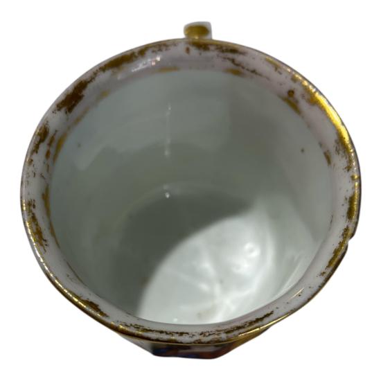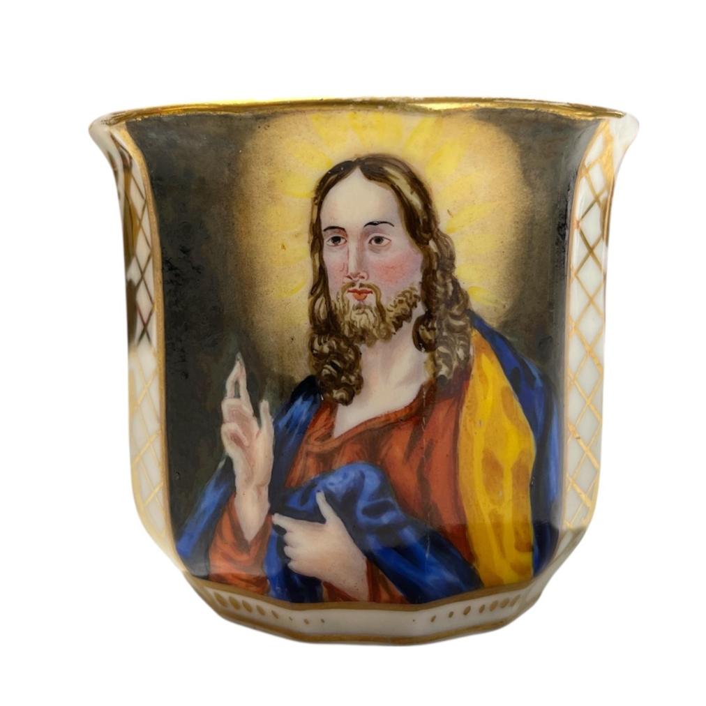 Starožitný drobný šálek s bohatým florálním dekorem a malbou Ježíše. Z vnější hrany hrdla drobný oťuk, zlacení je místy ošoupané,nejvíce na lemování. Průměr hrdla je 7,5 cm, průměr podstavy je 5 cm. Na výšku měří 6 cm. Neznačeno