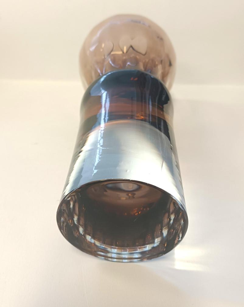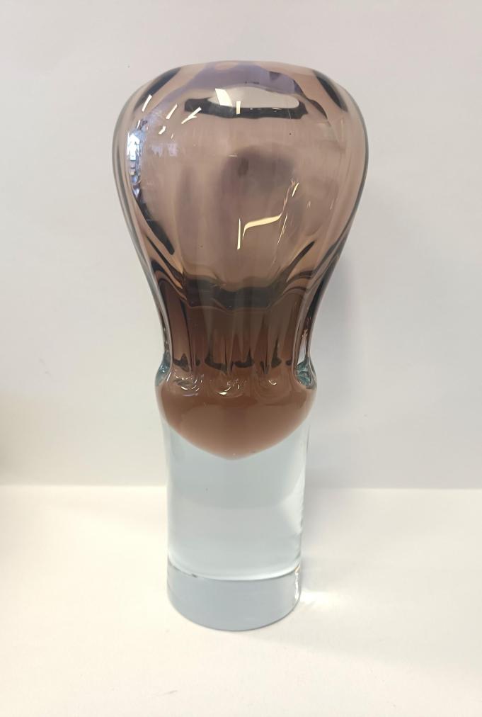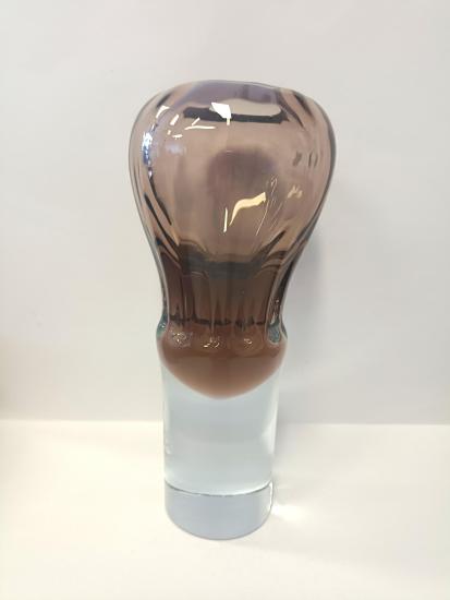 Hnědá váza z hutního skla na bílém podstavci. Rozměry: 23 x 10 cm. Váza je nepoškozená.