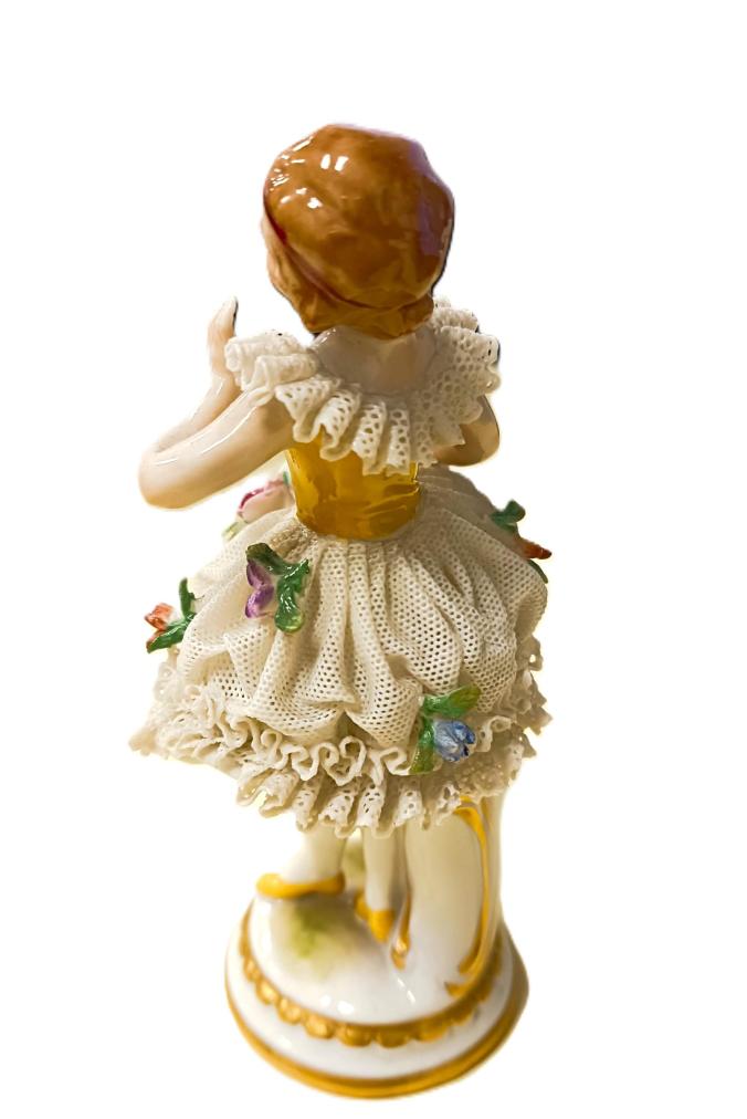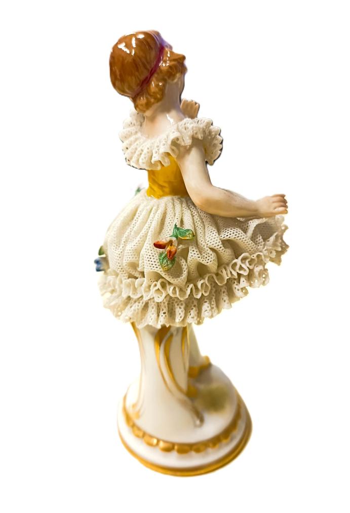 Krásná soška tanečnice v tylové sukni. Jedná se o předmět z německé manufaktury Volkstedt, z dílny Müller & CO. Soška je vysoká 14cm na podstavci o šířce 4,5cm. Sukně je mírně poškozená, viz foto. Značeno.