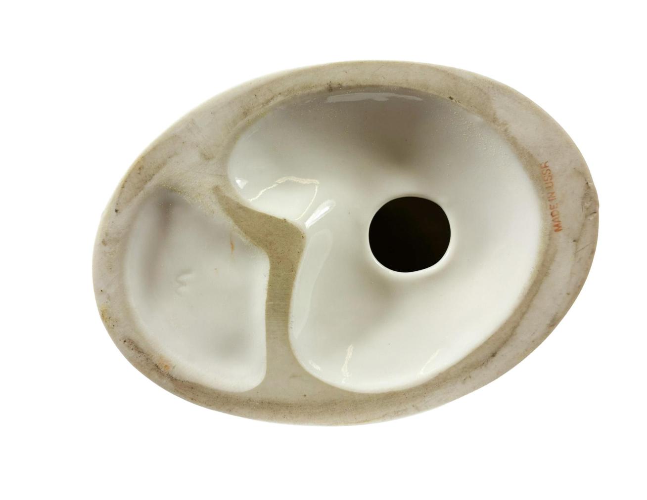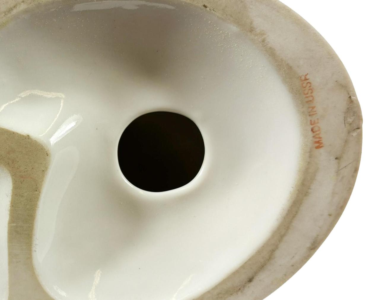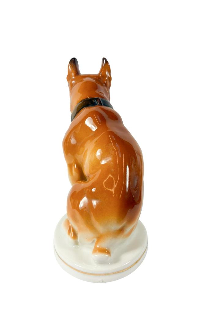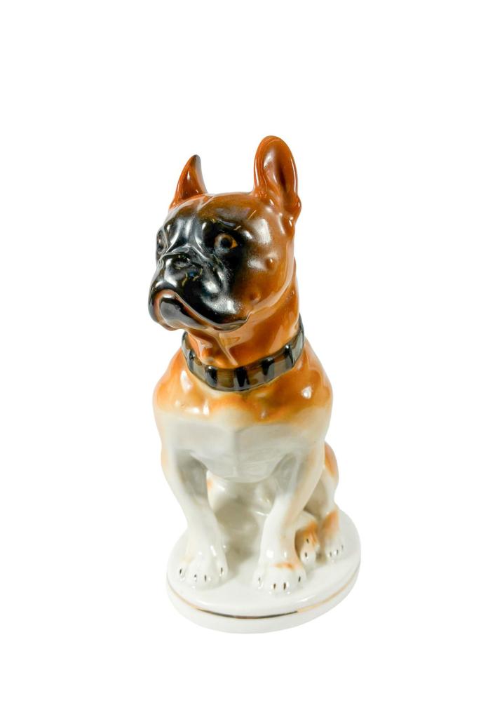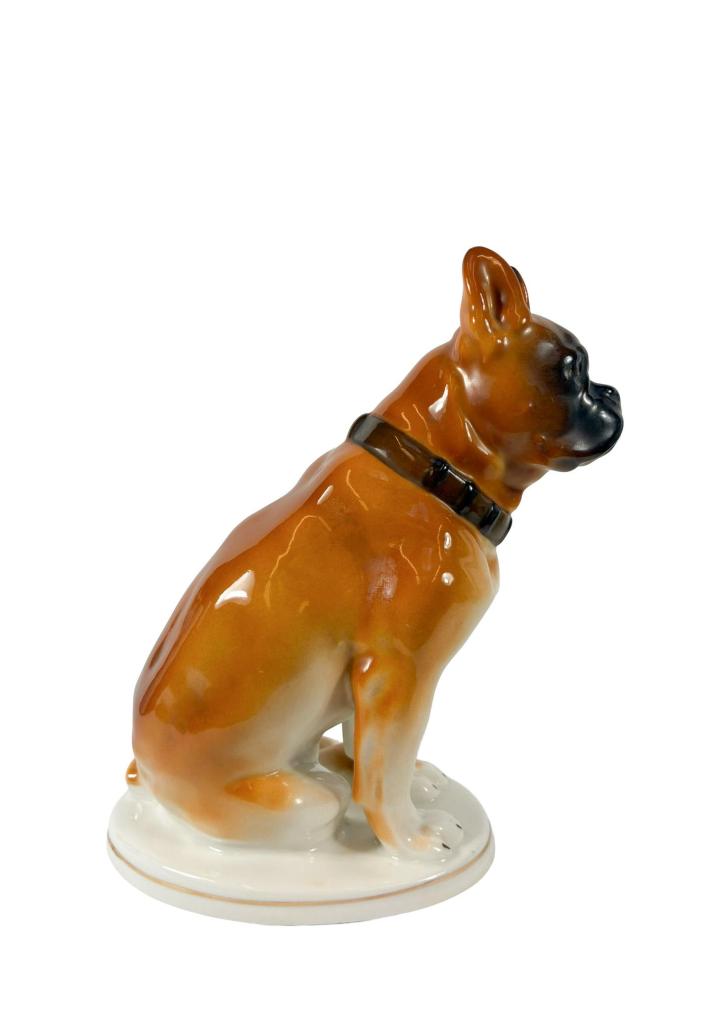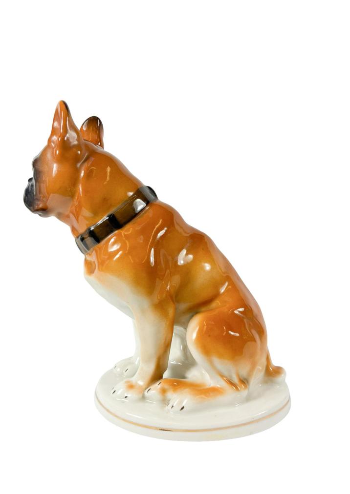Pěkná porcelánová soška boxera. Povrch přechází od sytě hnědé do tmavě hnědé glazury, podstavec a tlapy pokrývá bílá barva. Podstavec má jemnou zlacenou linku kolem. Výška 21 cm, hloubka 17 cm, rozměr podstavce 14 x 10,5 cm. Vespod značeno "Made in USSR".