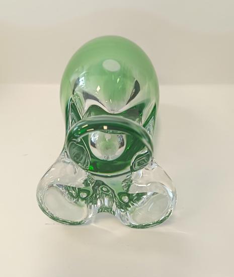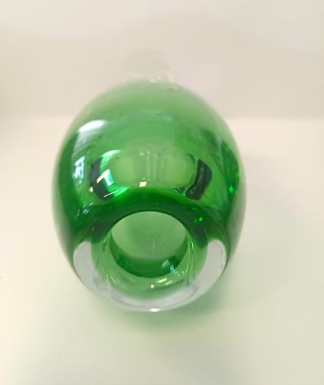 Tato zelená váza z hutního skla je produktem sklárny Egermann Nový Bor z druhé poloviny 20. století. Rozměry: 18,5 x 9 cm. Váza je nepoškozena.