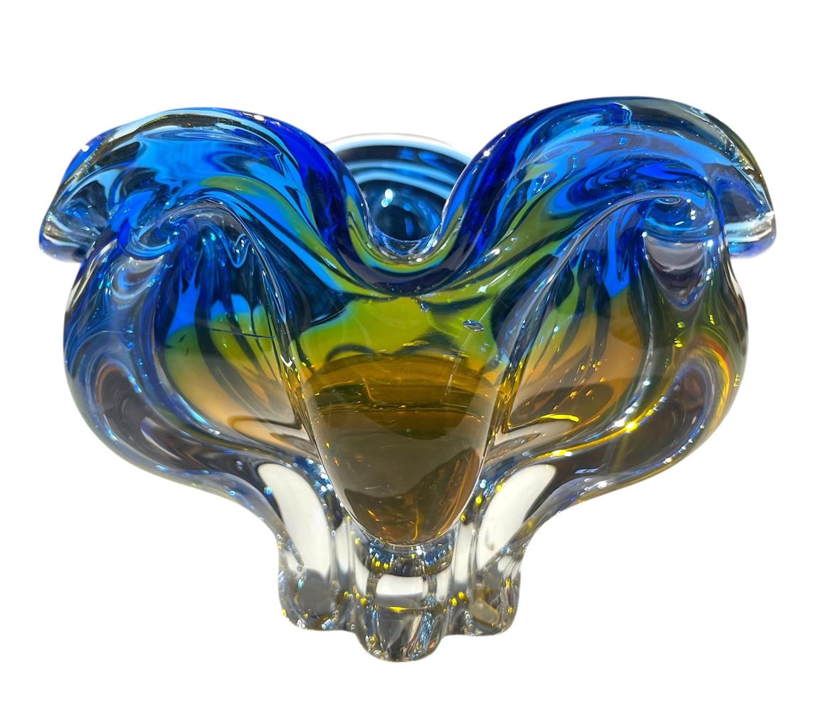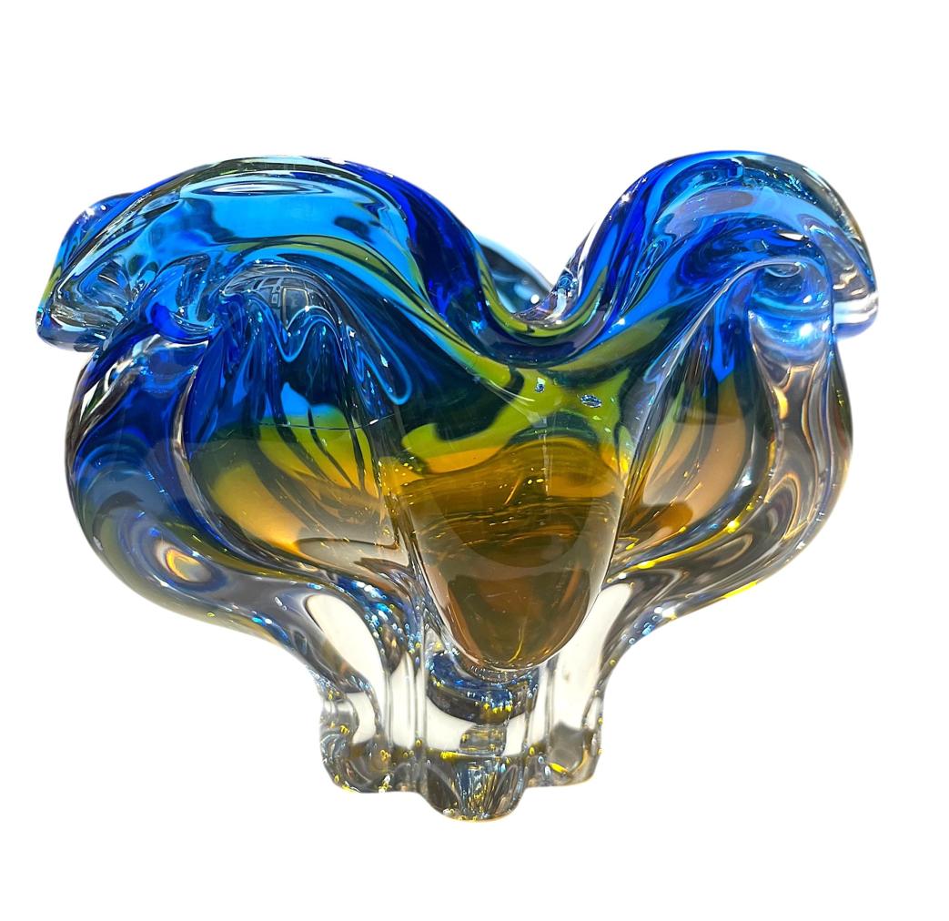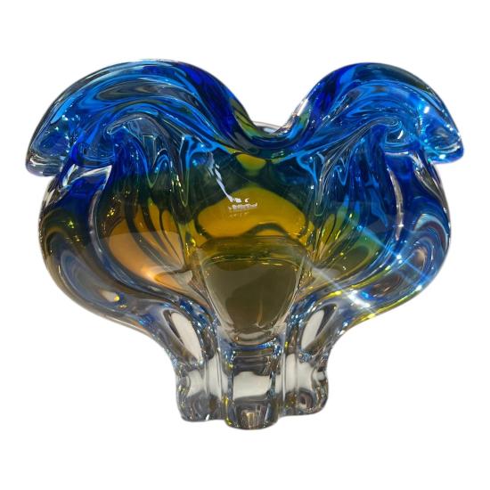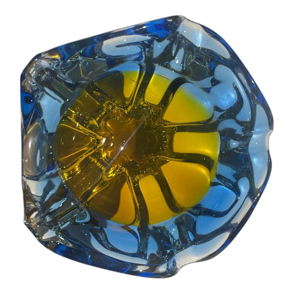 Popelník z hutního skla v sytých odstínech modré a žluté, navržen autorem Josefem Hospodkou ze sklárny Chřibská. Na výšku měří 13 cm. Průměr hrdla je 16 cm, průměr podstavy je 6 cm. Uvnitř skla se nachází dvě pukliny a pár bublinek. Lehce ošoupaná podstava. Neznačeno.