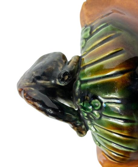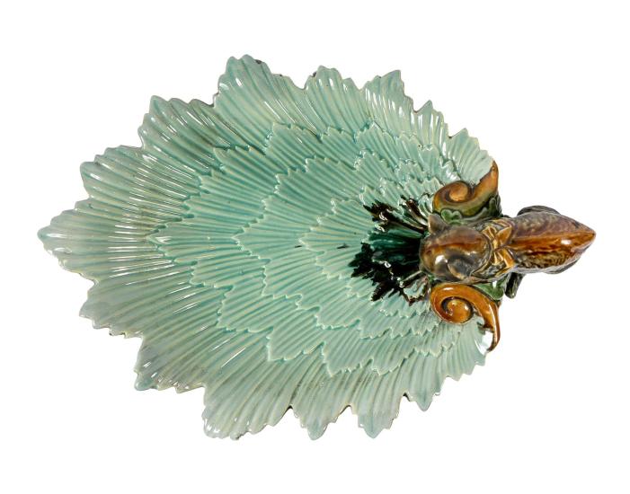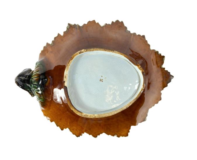 Porcelánová mísa s kočkou na okraji. Mísa je složená z florálních obrysů v tyrkysovém odstínu, kočka se krčí na okraji mísy a kouká dovnitř. Glazura je bez poškození a má velmi lesklý povrch. Výška 12 cm, rozměr mísy 30 x 22 cm. Na míse je jeden oťuk.