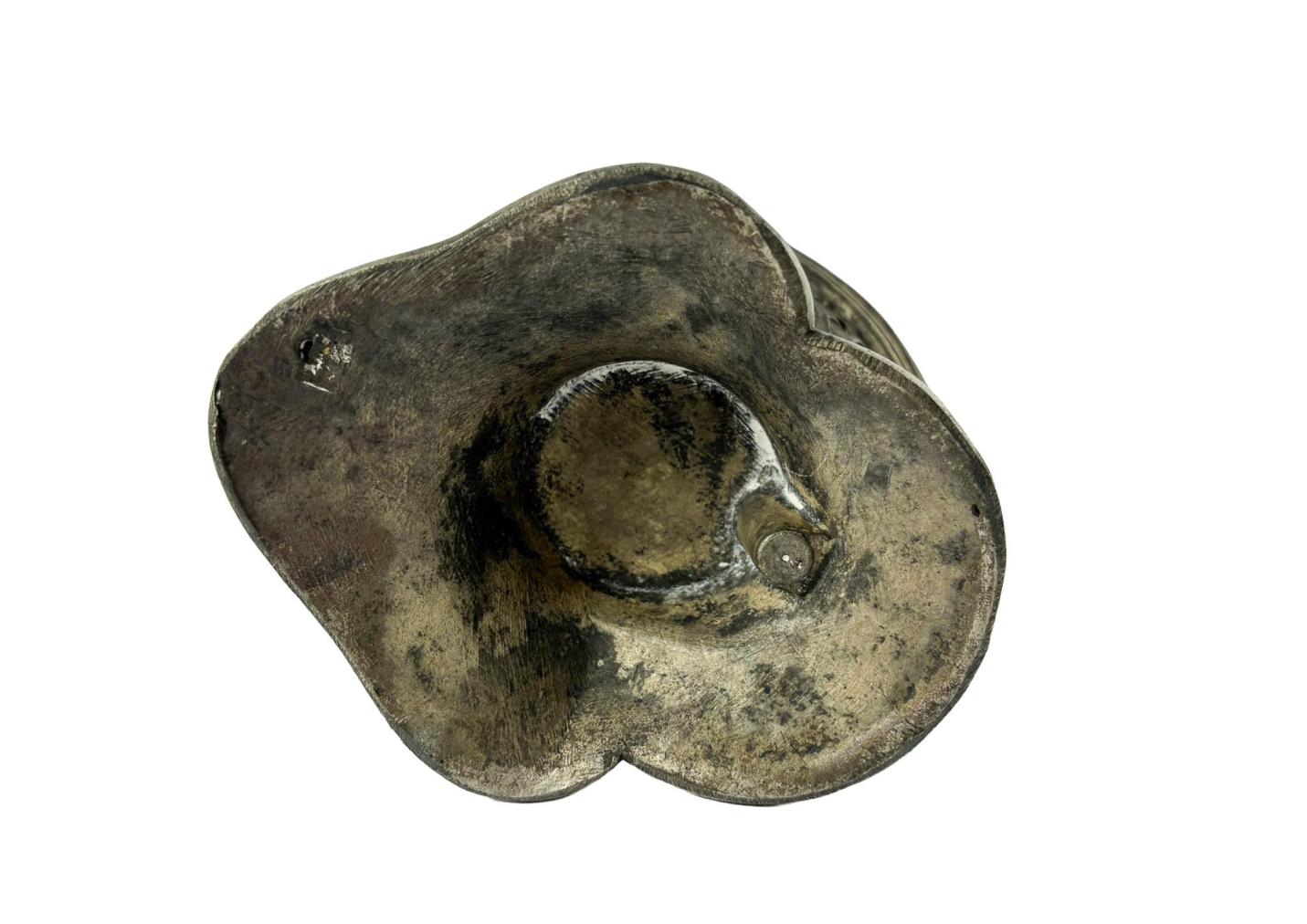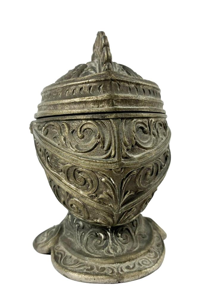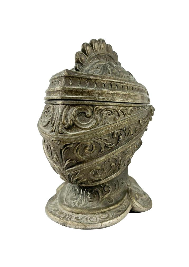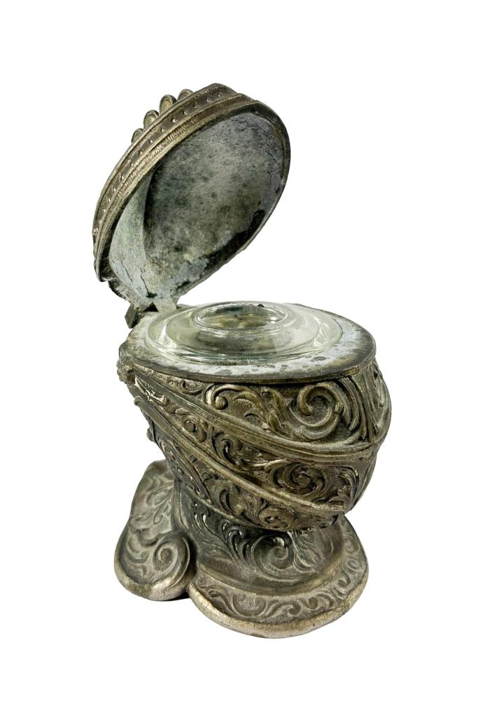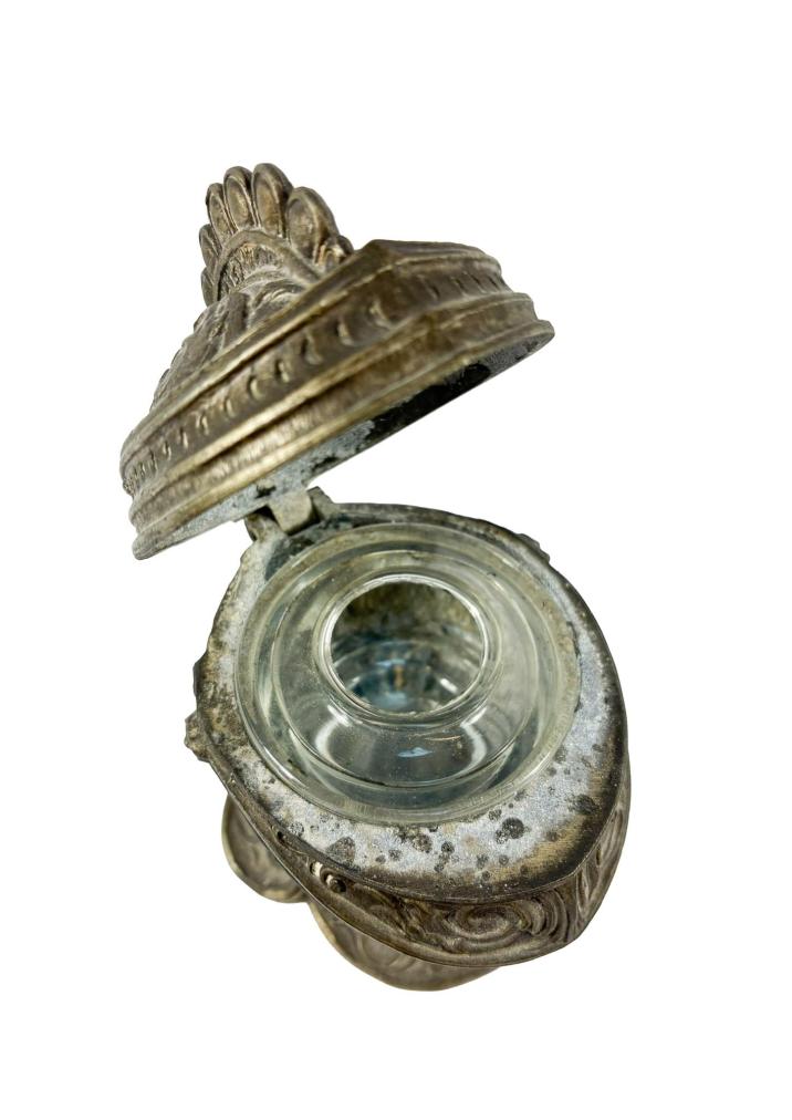 Originální kalamář ve tvaru rytířské helmy, kterou zdobí typické florální dekory. Výška 12 cm, v nejširším bodě 10 cm, podstava 9 x 7,5 cm, průměr skleněné nádoby na inkoust 6 cm, průměr otvoru 2,5 cm. Materál zinkocín.