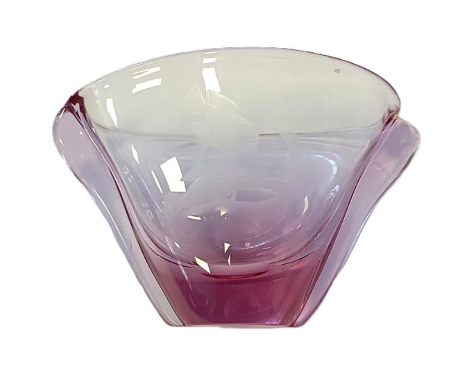 Krásná dekorativní mísa z hutního skla. Na přední straně vybroušené ryby. Rozměry: 11 x 19 cm na podstavci o průměru 5 cm. Mísa je nepoškozená.