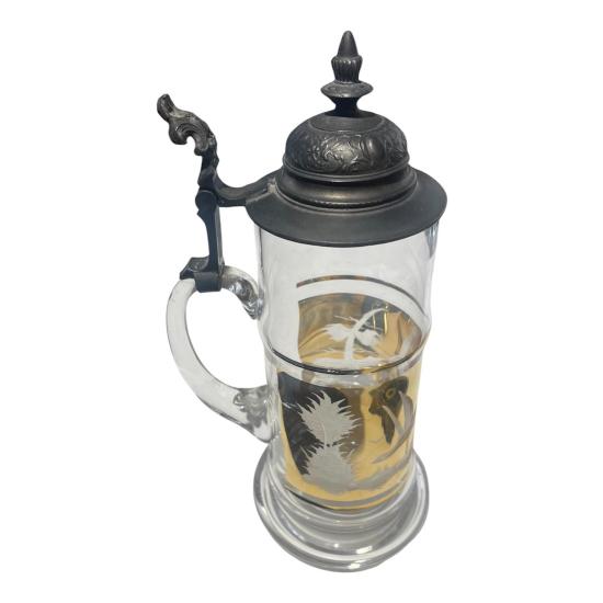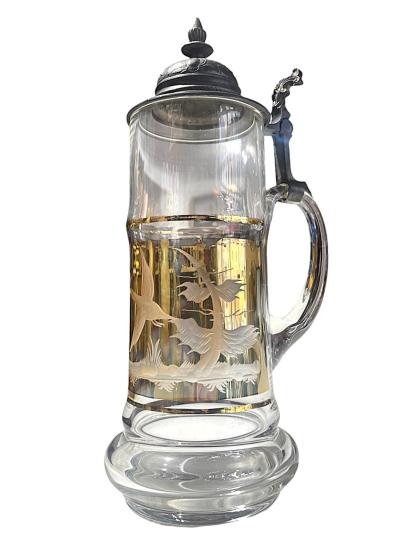 Starožitný korbel na pivo s připevněným cínovým víčkem, zdobený leptaným motivem letících kachen na zlatém pozadí. Celková výška je 30 cm. Průměr hrdla je 8,5 cm, průměr podstavy je 10 cm. Hloubka( i s uchem) je 16 cm. Na zlaté barvě se nachází pár škrábanců, jinak bez poškození. Neznačeno.