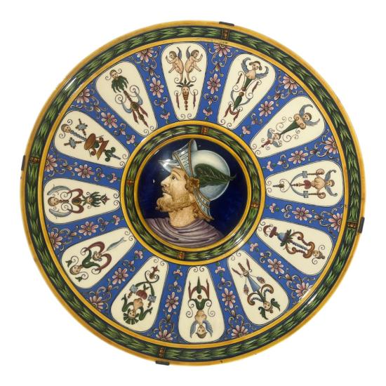 Pestře zdobený a detailně dekorovaný závěsný talíř s portrétem rytíře na kobaltovém pozadí, který je lemován zelenými girlandami. Průměr talíře je 40 cm. Hloubka je 4 cm. Talíř má ze zadní strany upevněnou kovovou konstrukci pro bezečnější zavěšení. V perfektním stavu bez poškození. Neznačeno.