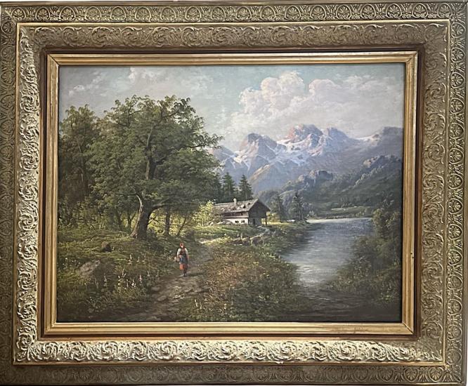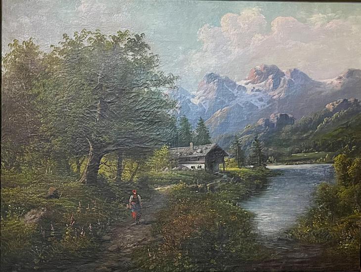Prohlednout celou aukciKrásná malba horské krajiny s řekou a horami, na kterých zůstávají zbytky sněhu. Uprostřed obrazu vidíme chalupu, od níž kráčí naším směrem žena nesoucí košík. Olej na plátně, zarámováno do mohutného rámu se zlatou a jemně zelenou patinou. Rozměry malby jsou 63 x 48 cm. Celkové rozměry s rámem jsou 87 x 72 cm. Olej na plátně. Signatura se nachází na pravé straně dole, ale není čitelná. Plátno je opravované viz foto, rám má téměř neznatelné oťuky.