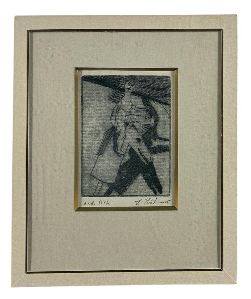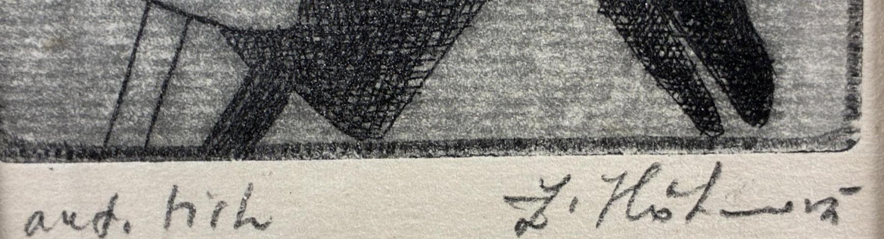 Prohlednout celou aukciVtipná grafika s námětem ženy, která sedí na koni. Jedná se ale o koně na tyči, hračku pro děti, na které sedí žena, jejíž tělo je poskládané z různě pootočených částí, její postava je v podivné poloze. Tato dvojice vrhá stín. Grafika vyznívá skvěle ve své jednoduchosti a uvolněnosti. Suchá jehla na papíře, paspartováno pod sklem, rozměry s paspartou 26 x 21 cm, rozměry díla 12 x 8 cm. Signováno vpravo dole Z.H.