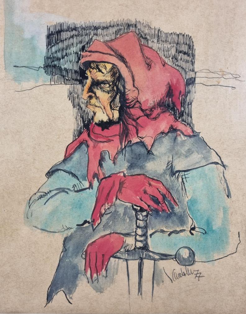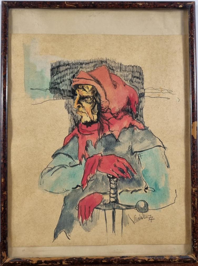 Prohlednout celou aukciPovedená perokresba doplněná o akvarelové plochy zobrazující temnou postavu kata. Postava má přísný, děsivý výraz v obličeji a rozevláté vlasy, připomíná pohádkovou postavu ježibaby. Umělec zajímavě pojímá pozadí za postavou, které vytváří za pomocí plochy zaplněné šrafurou doplněné o pár linek, které naznačují horizont. Kombinovaná technika na papíře, rámováno pod sklem, rozměry s rámem 39 x 29 cm, rozměry díla 37 x 27 cm. Signováno vpravo dole.