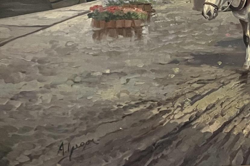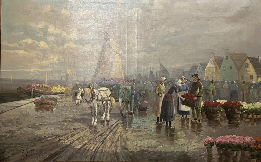 Prohlednout celou aukciPovedená malba, vyobrazující výjev z květinového trhu v přístavu. Divák si povšimne příjemných pastelových barev a plachet lodí, které částečně splývají s oblačnou oblohou, dále davu lidí v pozadí. Olej na plátně, zarámováno do dřevěného černého rámu. Rozměry malby jsou 102 x 65 cm. Celkové rozměry s rámem jsou 124 x 87 cm. Signatura se nachází na pravé straně dole viz foto.