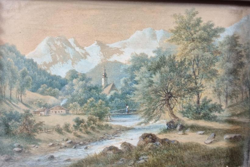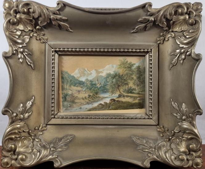 Prohlednout celou aukciMalba velmi drobného formátu od neznámého autora s námětem údolí v obklopení zasněžených hor. Krajinou se line průzračně čistý potůček, přes něj vede most na kterém stojí ženská postava. Umělec maluje za pomocí nejtenčích tahů a velmi se soustředí na detail. Drobná malba je zasazena do masivního rámu. Akvarel na papíře, rámováno pod sklem, rozměry s rámem 32 x 27 cm, rozměry díla 15 x 10 cm. Nesignováno. Kresba je vyjetá mimo plochu rámu.