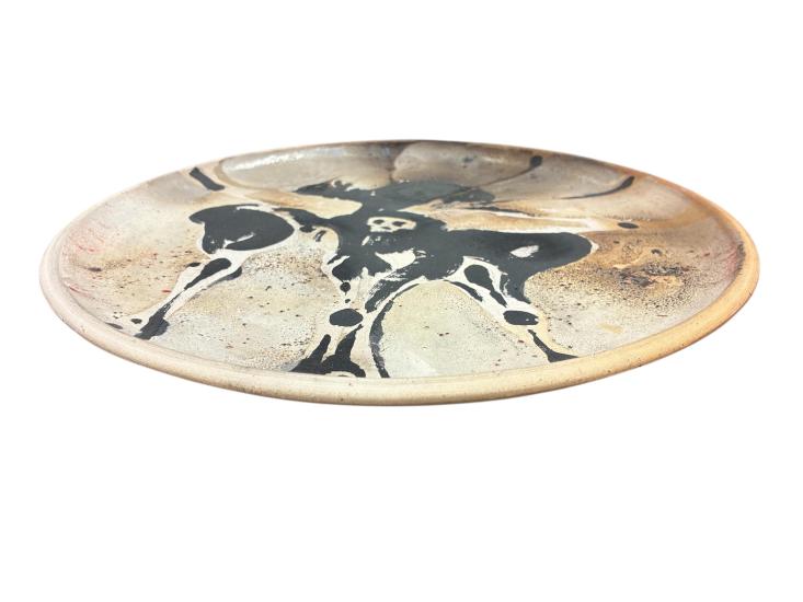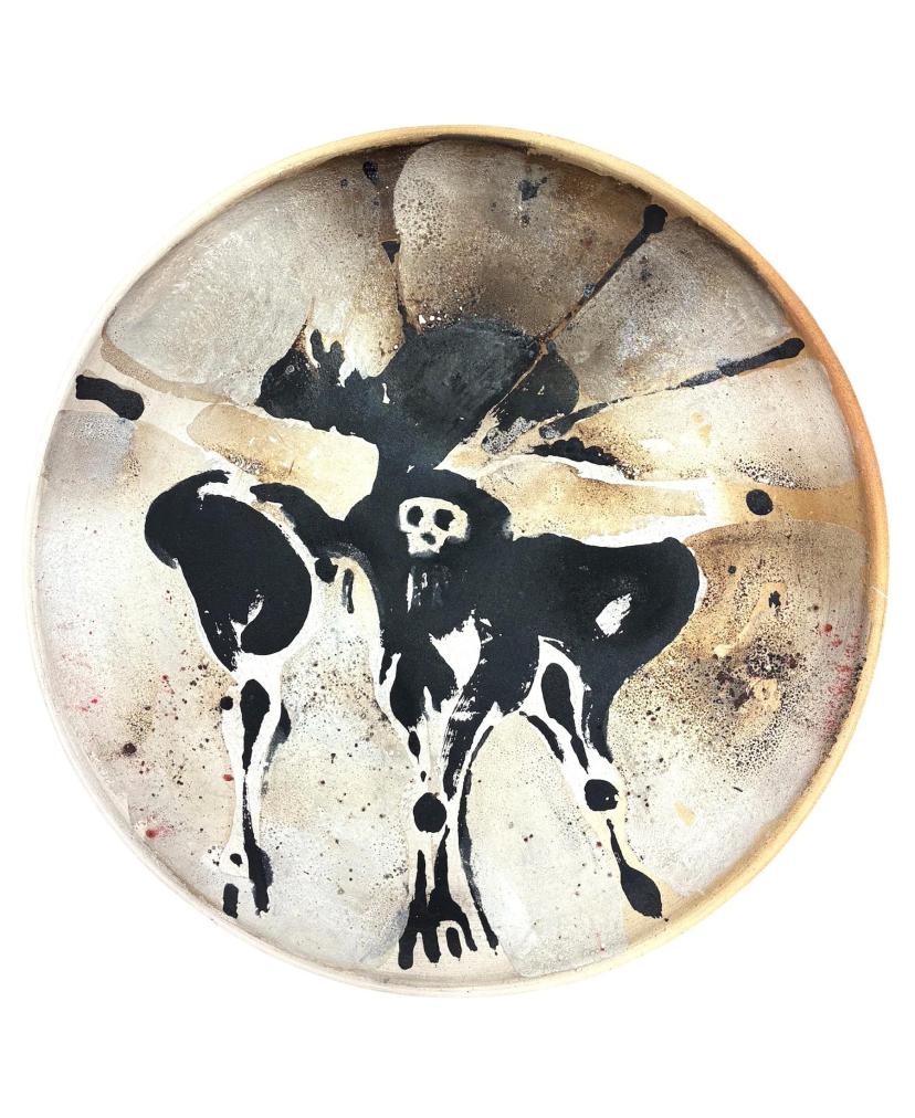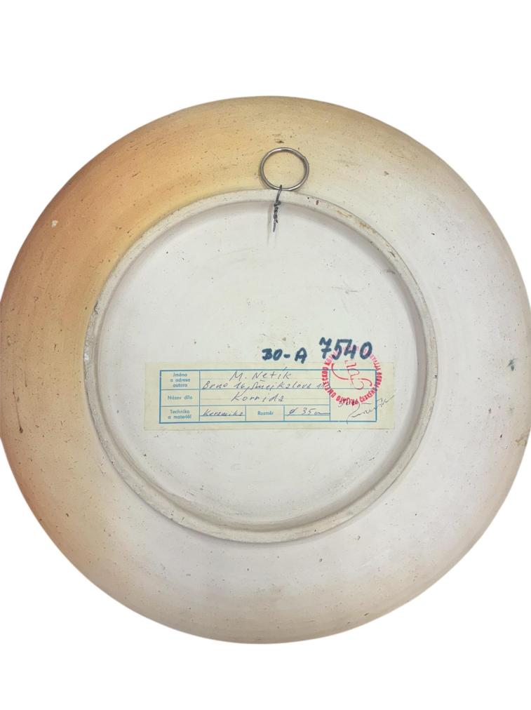 Prohlednout celou aukciVelký keramický talíř s abstraktní malbou Miroslava Netíka nesoucí název Korrida. Průměr talíře je 35,5 cm. Hloubka je 4 cm. Značeno ze zadní strany autorským štítkem viz foto. Opatřeno háčkem pro zavěšení. V perfektním stavu, bez poškození.