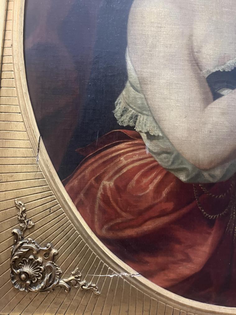 Prohlednout celou aukciOválný portrét mladé ženy ve zdobném rámur. Autor neznámý. Olej na plátně, zarámováno do dřevěného rámu zlaté barvy. Žena je oděna do prostých jednoduchách šatů bez ozdob a bez šperků, rukou si rozpačitě zakrývá dekolt. Rozměry malby jsou 76 x 60 cm a celkové rozměry s rámem jsou 82 x 97 cm. Rám má drobné nedostatky či lehké praskliny viz foto. Nesignováno.