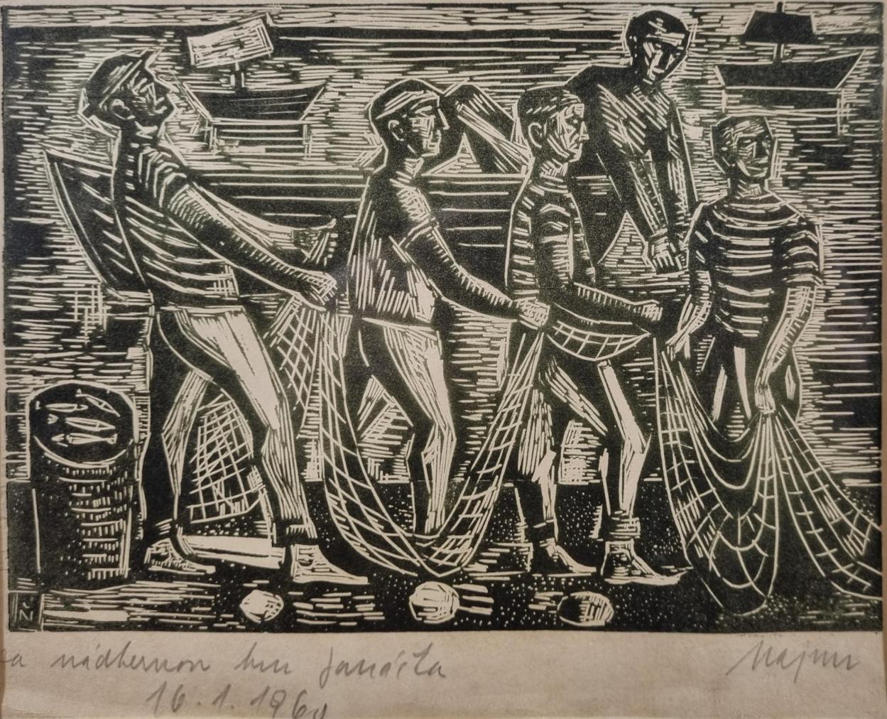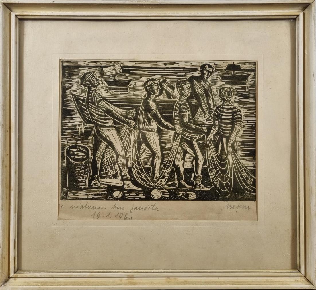 Prohlednout celou aukciPěkná černobílá grafika s námětem rybářů. Dílo je zajímavé kompozičně, rybáři za sebou stojí v řadě a drží sítě, za nimi se rozléhá hladina moře. Šrafura je v díle naprosto zásadní a vyplňuje veškerou plochu grafiky. Dřevoryt na papíře, rámováno pod sklem, rozměry s rámem 33 x 30 cm, rozměry díla 20 x 15 cm. Signováno vpravo dole ?, věnování vpravo dole "Za nádhernou hru Janáčka 16.1.1960". Signováno Najmr.