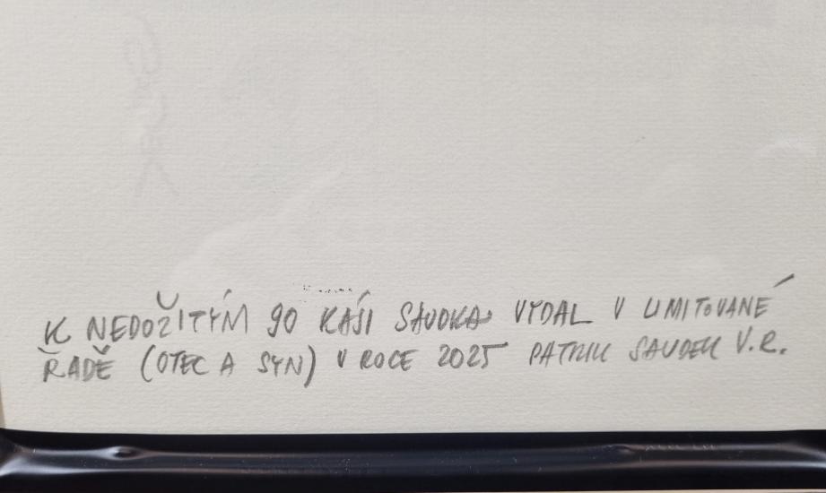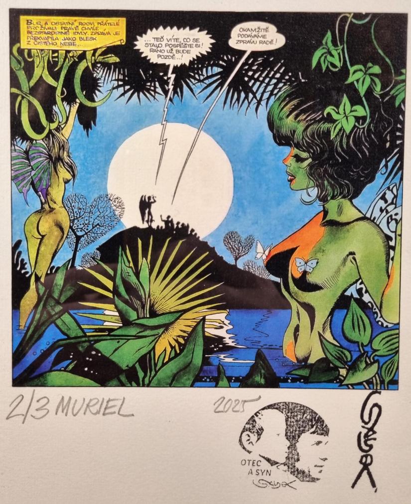 Prohlednout celou aukciGrafika od Káji Saudka s názvem Muriel. Dílo vyšlo v limitované edici k výročí autorových nedožitých 90 let, edici vydal jeho syn Patrik Saudek. V obraze vidíme tropický ráj s ženskými postavami, exotické rostliny lemují celý výjev a na obzoru zrovna vychází měsíc. Saudek ovládl formát komiksu a byl jedním z předních výtvarníků na české scéně. Grafický tisk, rámováno pod sklem, rozměry s rámem 32 x 23 cm, rozměry díla 14 x 14,5 cm. Signováno vpravo dole - otec a syn 2025, výtisk 2/3 Muriel. Zezadu popis "K nedožitým 90 Káji Saudka vydal v limitované řadě (otec a syn) v roce 2025 Patrik Saudek V. R.".